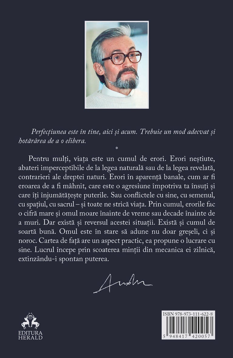 In volumul anterior si ingemanat cu acesta, Viata si semn, avansam o promisiune si un avertisment: nimeni nu moare de moarte buna, ci de cumul de erori. Omul este facut pentru realizare si longevitate. El este „programat" natural pentru o viata de peste 100 de ani; capacitatea celulelor de a se multiplica s-ar epuiza spre 120 de ani! Dar omul rateaza aceste premise cantitative si calitative ale fiintei. El traieste putin, adica sub programul sau natural; el nu stie sa-si dezvaluie calitatile de exceptie. Insumarea erorilor mici si mari, de fiecare zi, scurteaza viata si o intuneca. Pentru multi, viata este un cumul de erori. Erori nestiute, abateri imperceptibile de la legea naturala sau de la legea revelata, contrarieri ale dreptei naturi. Erori in aparenta banale, cum ar fi eroarea de a fi mahnit, care este o agresiune impotriva ta insuti si care iti injumatateste puterile. Sau conflictele cu sine, cu seamanul, cu spatiul, cu sacrul – si toate ne strica viata. Prin cumul, erorile fac o cifra mare si omul moare inainte de vreme sau decade inainte de a muri. Dar exista si inversul acestei situatii.
