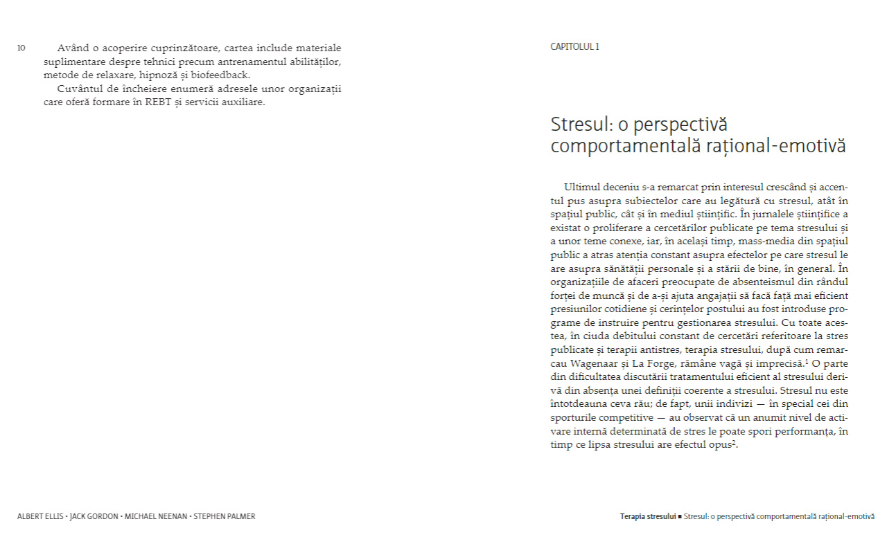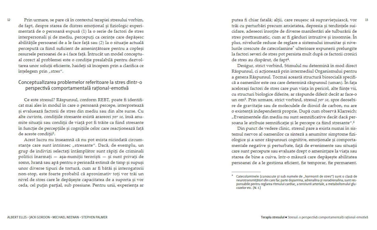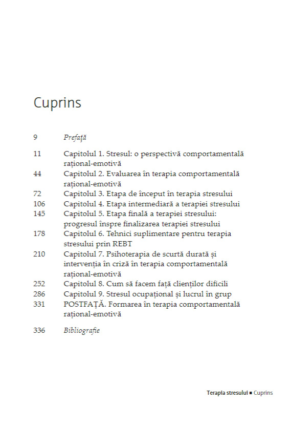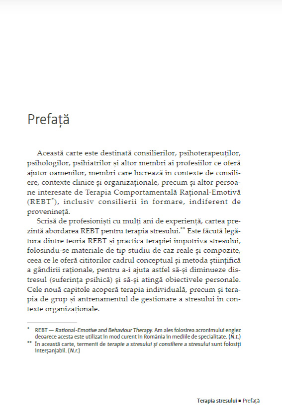 Scrisă de specialiști cu mulți ani de experiență, cartea prezintă abordarea comportamentală rațional-emotivă pentru terapia stresului, atât de necesară în perioada actuală. Numeroase studii de caz oferă posibilitatea de a lega teoria de practică, oferindu-le cititorilor cadrul conceptual și metoda științifică a gândirii raționale, pentru a‑i ajuta astfel să‑și diminueze distresul (suferința psihică) și să‑și atingă obiectivele personale. Cele nouă capitole acoperă terapia individuală, precum și terapia de grup și antrenamentul de gestionare a stresului în contexte organizaționale. Având o acoperire cuprinzătoare, cartea include materiale suplimentare despre tehnici precum antrenamentul abilităților, metode de relaxare, hipnoză și biofeedback.