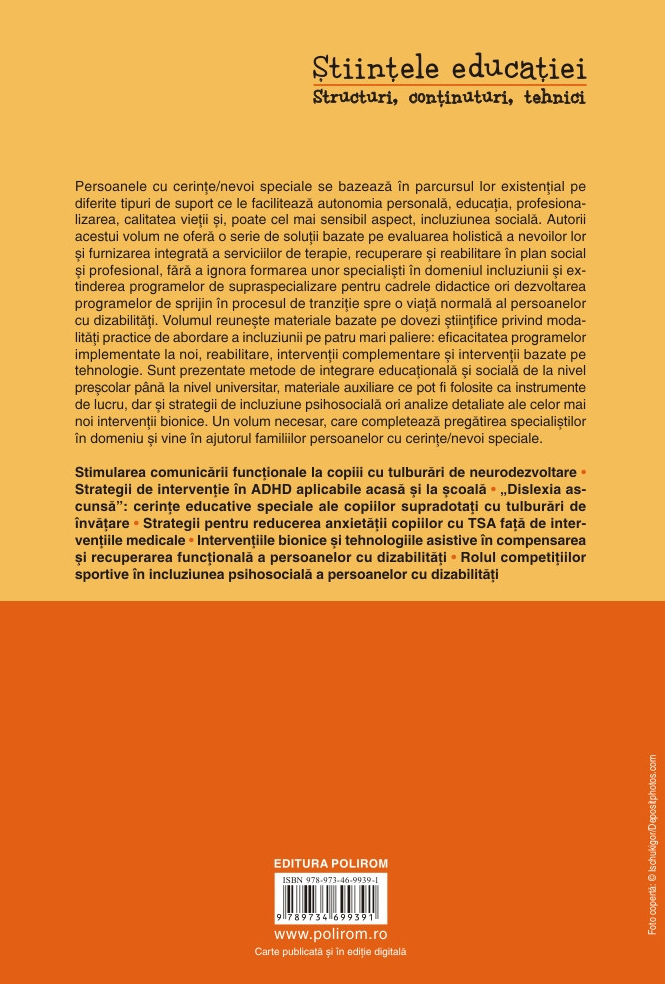 Persoanele cu cerințe/nevoi speciale se bazează în parcursul lor existențial pe diferite tipuri de suport ce le facilitează autonomia personală, educația, profesionalizarea, calitatea vieții și, poate cel mai sensibil aspect, incluziunea socială. Autorii acestui volum ne oferă o serie de soluții bazate pe evaluarea holistică a nevoilor lor și furnizarea integrată a serviciilor de terapie, recuperare și reabilitare în plan social și profesional, fără a ignora formarea unor specialiști în domeniul incluziunii și extinderea programelor de supraspecializare pentru cadrele didactice ori dezvoltarea programelor de sprijin în procesul de tranziție spre o viață normală al persoanelor cu dizabilități. Volumul reunește materiale bazate pe dovezi științifice privind modalități practice de abordare a incluziunii pe patru mari paliere: eficacitatea programelor implementate la noi, reabilitare, intervenții complementare și intervenții bazate pe tehnologie. Sunt prezentate metode de integrare educațională și socială de la nivel preșcolar până la nivel universitar, materiale auxiliare ce pot fi folosite ca instrumente de lucru, dar și strategii de incluziune psihosocială ori analize detaliate ale celor mai noi intervenții bionice. Un volum necesar, care completează pregătirea specialiștilor în domeniu și vine în ajutorul familiilor persoanelor cu cerințe/nevoi speciale.