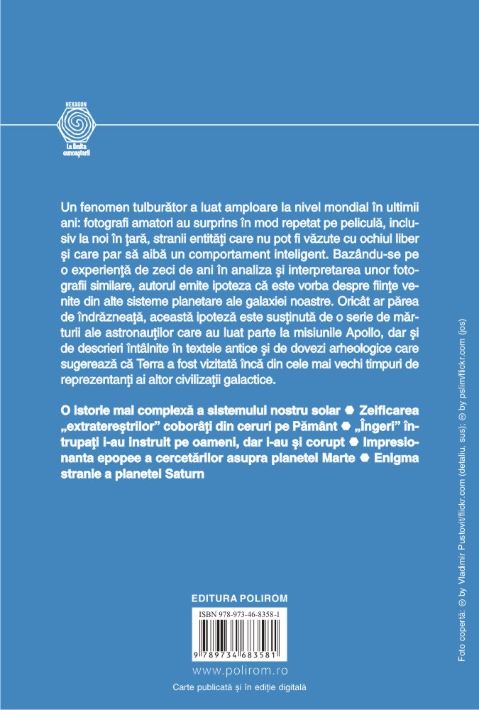 Un fenomen tulburător a luat amploare la nivel mondial în ultimii ani: fotografi amatori au surprins în mod repetat pe peliculă, inclusiv la noi în țară, stranii entități care nu pot fi văzute cu ochiul liber și care par să aibă un comportament inteligent. Bazîndu-se pe o experiență de zeci de ani în analiza și interpretarea unor fotografii similare, autorul emite ipoteza că este vorba despre ființe venite din alte sisteme planetare ale galaxiei noastre. Oricît ar părea de îndrăzneață, această ipoteză este susținută de o serie de mărturii ale astronauților care au luat parte la misiunile Apollo, dar și de descrieri întîlnite în textele antice și de dovezi arheologice care sugerează că Terra a fost vizitată încă din cele mai vechi timpuri de reprezentanți ai altor civilizații galactice.