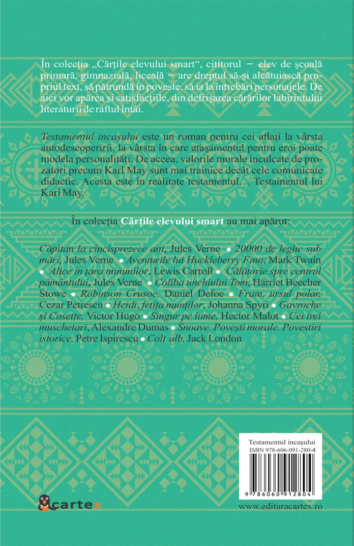 Testamentul incasului este un roman pentru cei aflati la varsta autodescoperirii, la varsta in care atasamentul pentru eroi poate modela personalitati. De aceea, valorile morale inculcate de prozatori precum Karl May sunt mai trainice decat cele comunicate didactic. Acesta este in realitate testamentul… Testamentul lui Karl May.