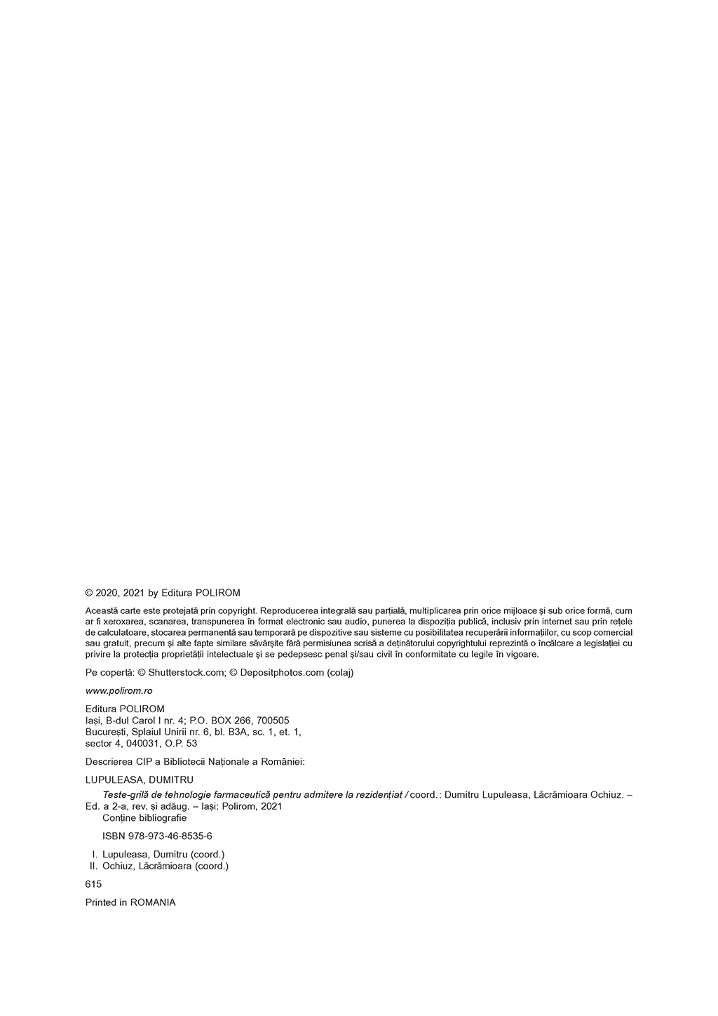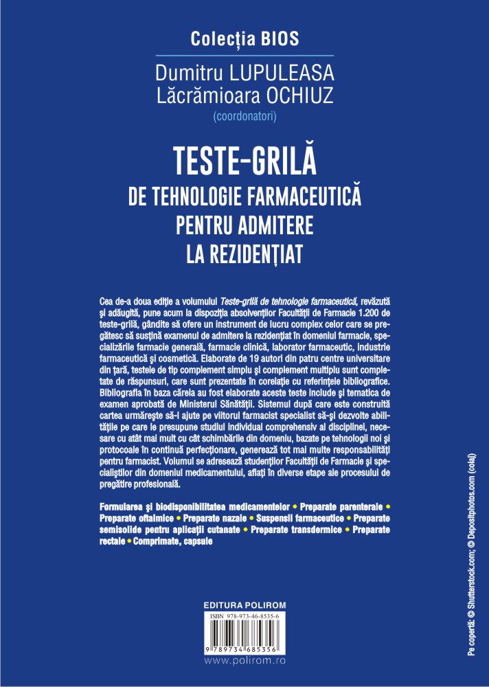 Cea de-a doua ediţie a volumului Teste-grilă de tehnologie farmaceutică, revăzută şi adăugită, pune acum la dispoziţia absolvenţilor Facultăţii de Farmacie 1.200 de teste-grilă, gîndite să ofere un instrument de lucru complex celor care se pregătesc să susţină examenul de admitere la rezidenţiat în domeniul farmacie, specializările farmacie generală, farmacie clinică, laborator farmaceutic, industrie farmaceutică şi cosmetică. Elaborate de 19 autori din patru centre universitare din ţară, testele de tip complement simplu şi complement multiplu sînt completate de răspunsuri, care sînt prezentate în corelaţie cu referinţele bibliografice. Bibliografia în baza căreia au fost elaborate aceste teste include şi tematica de examen aprobată de Ministerul Sănătăţii. Sistemul după care este construită cartea urmăreşte să-l ajute pe viitorul farmacist specialist să-şi dezvolte abilităţile pe care le presupune studiul individual comprehensiv al disciplinei, necesare cu atît mai mult cu cît schimbările din domeniu, bazate pe tehnologii noi şi protocoale în continuă perfecţionare, generează tot mai multe responsabilităţi pentru farmacist. Volumul se adresează studenţilor Facultăţii de Farmacie şi specialiştilor din domeniul medicamentului, aflaţi în diverse etape ale procesului de pregătire profesională.