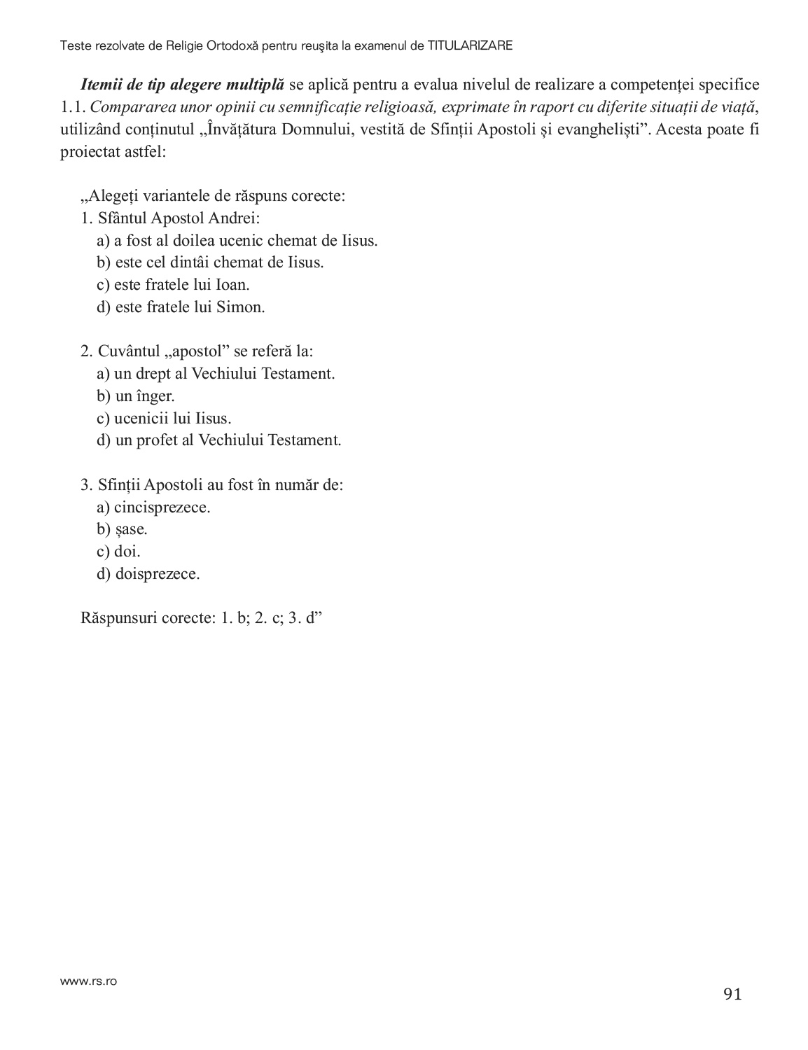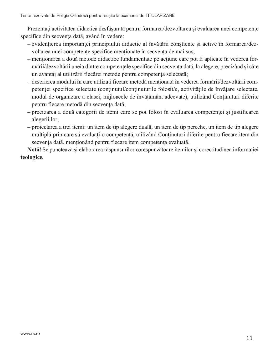 Fiecare test in parte va familiarizeaza cu structura stabilita de M.E. pentru un test, dar si cu tematica specifica domeniilor teologice stabilite de programa in vigoare.