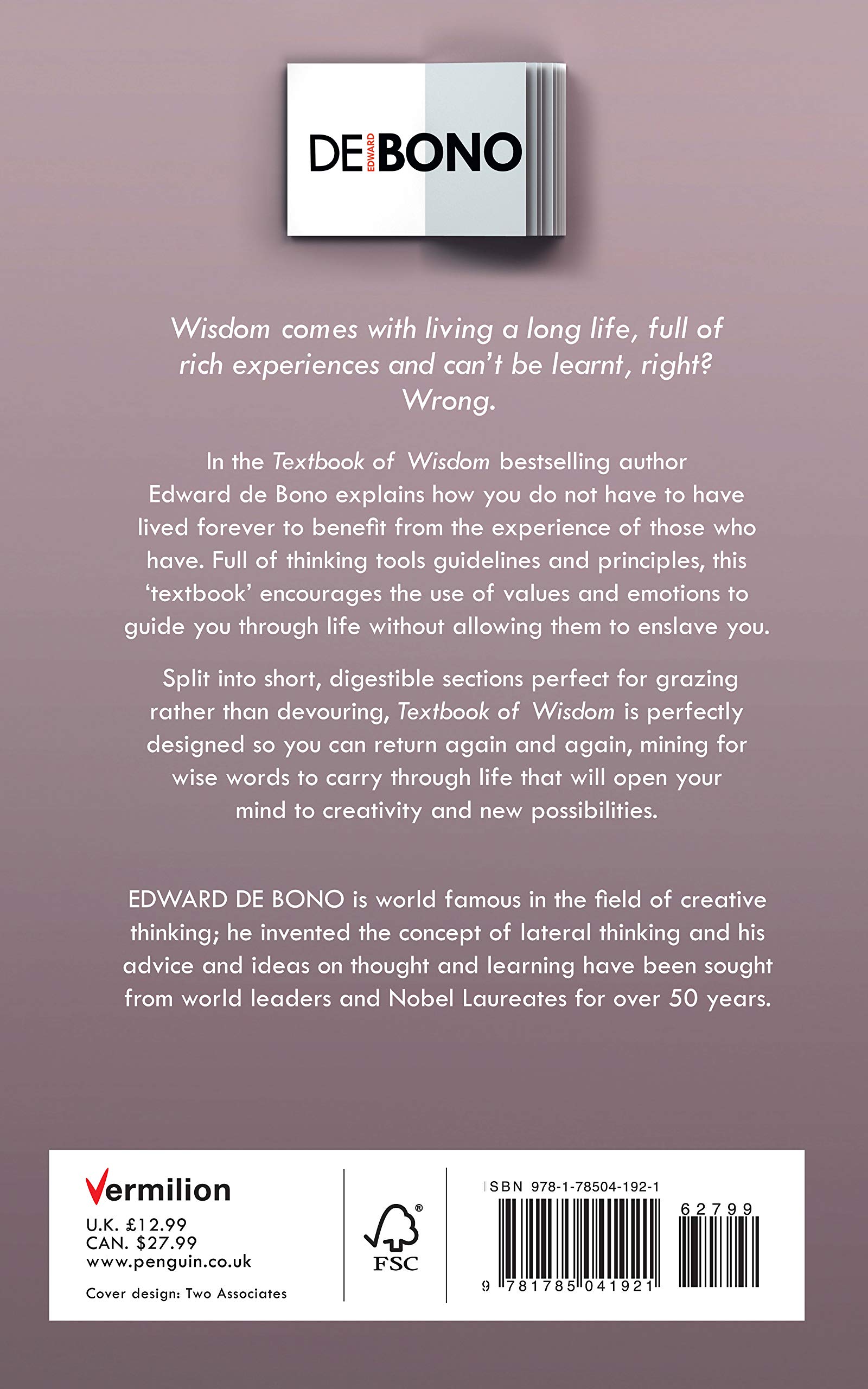 In the Textbook of Wisdom bestselling author Edward De Bono (Lateral Thinking, Serious Creativity) explains how you do not have to have lived forever to benefit from the experience of those who have. Full of thinking tools guidelines and principles this ‘textbook’ encourages the use of values and emotions to guide you through life without allowing them to enslave you.