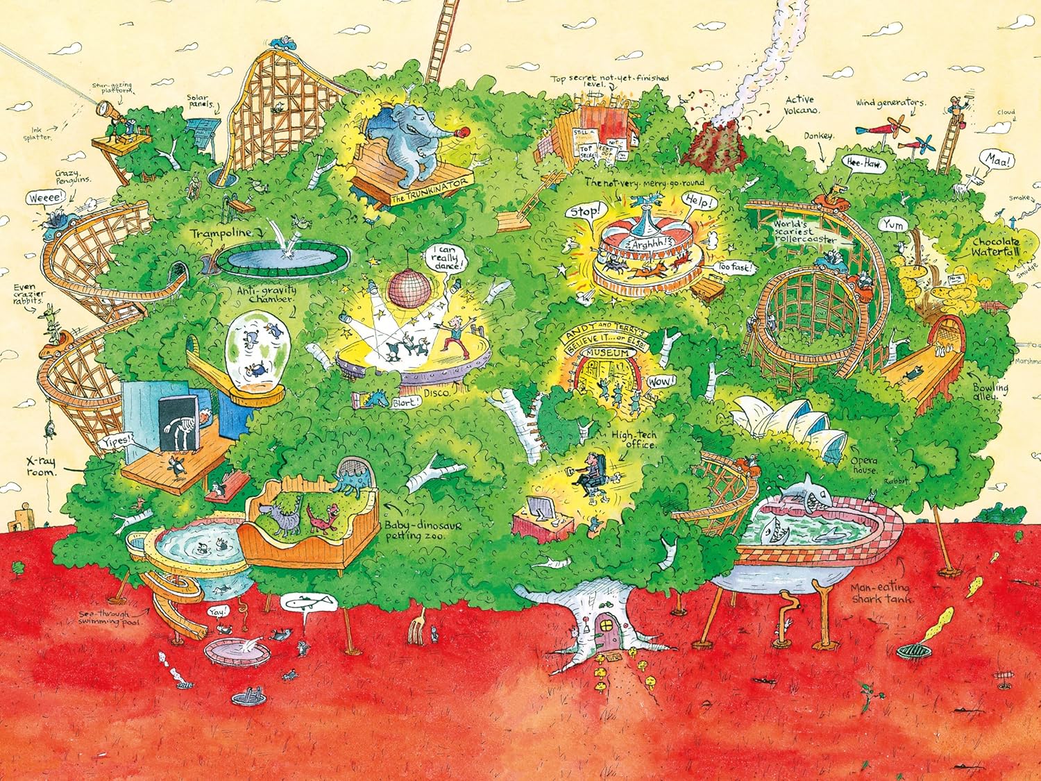 They've added a chocolate waterfall you can swim in, a volcano for toasting marshmallows, a bulldozer-battling level, a baby-dinosaur-petting zoo, a not-very-merry merry-go-round, a boxing elephant called the Trunkinator, an X-ray room, a disco with light-up dance floor, the world's scariest roller coaster and a top-secret thirty-ninth level which hasn't even been finished yet!