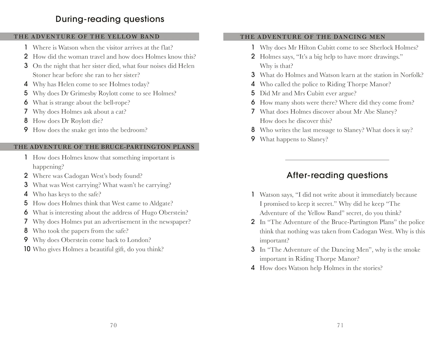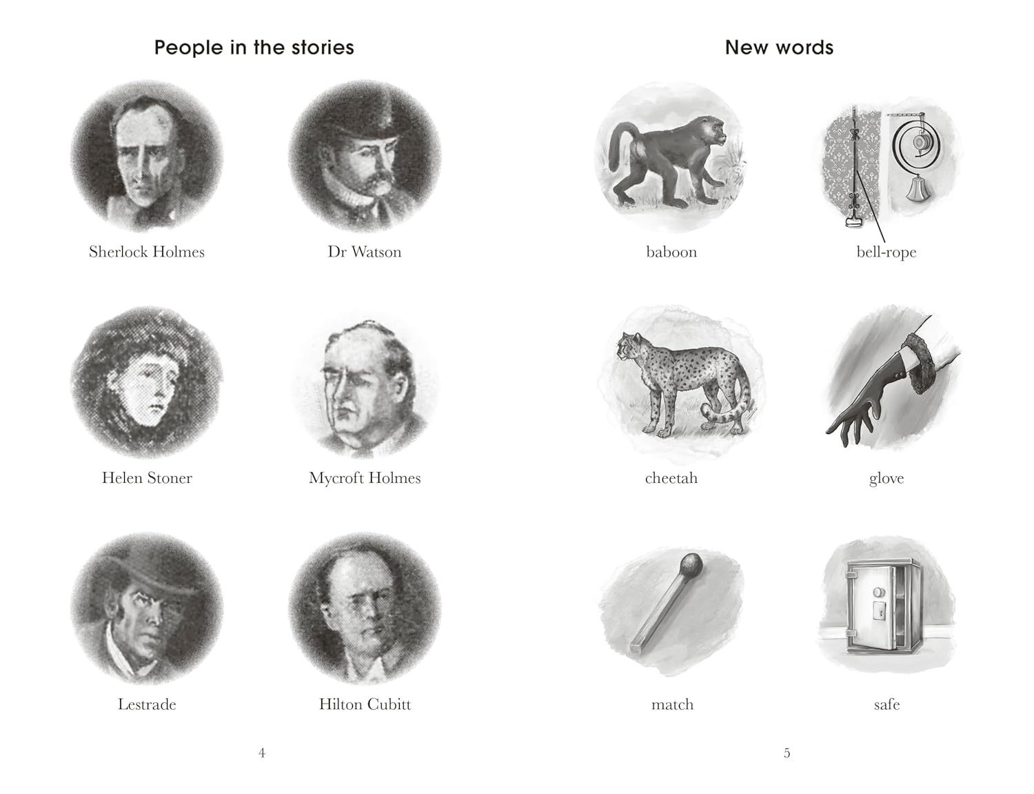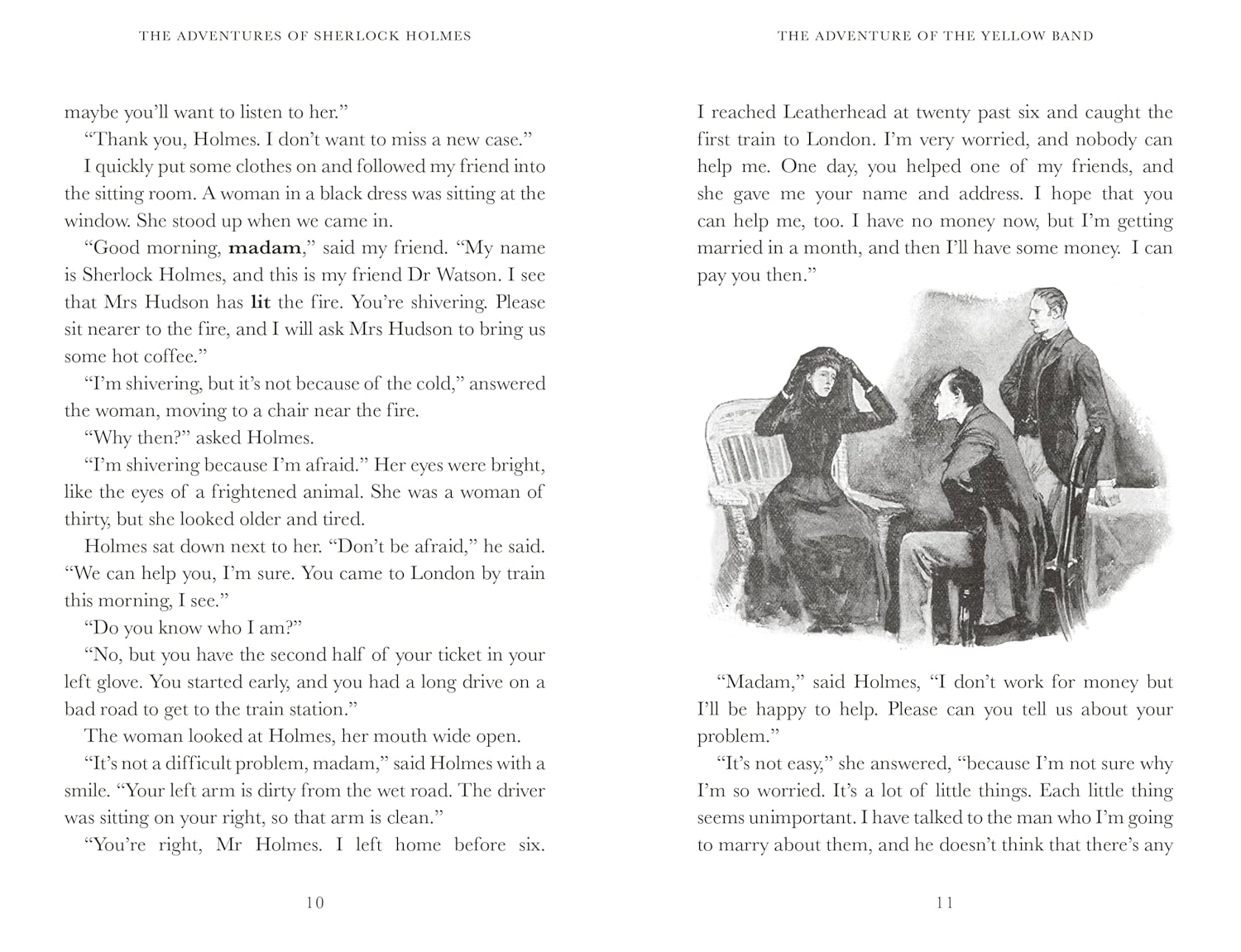 The Adventures of Sherlock Holmes, a Level 4 Reader, is A2+ in the CEFR framework. The text is made up of sentences with up to three clauses, introducing more complex uses of present perfect simple, passives, phrasal verbs and simple relative clauses. It is well supported by illustrations, which appear regularly.