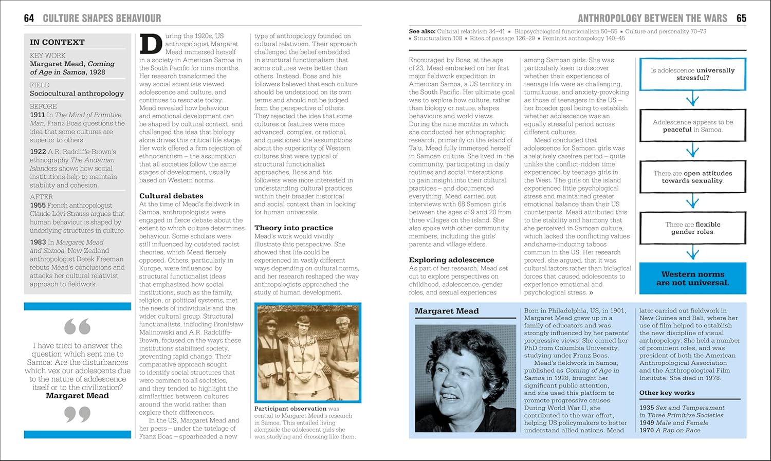 What does it mean to be human? Why do we have rituals? How do family structures differ around the world, and why? The Anthropology Book answers questions like these and many, many more. Applying the “Big Ideas” series’ combination of authoritative, accessible text and bold graphics, The Anthropology Book introduces key concepts from different branches of the subject, such as cultural anthropology, ethnography, and biological anthropology, and explains how they have developed over the past century. The book explores the origins of human life and cultures, and how societies develop traditions, laws, and languages. Profiling renowned anthropologists, such as Claude Lévi-Strauss and Margaret Mead, and covering topics as diverse as biology, medicine, war, sexuality, family roles, and kinship, The Anthropology Book is a fascinating, accessible introduction to the core principles of anthropological thought.