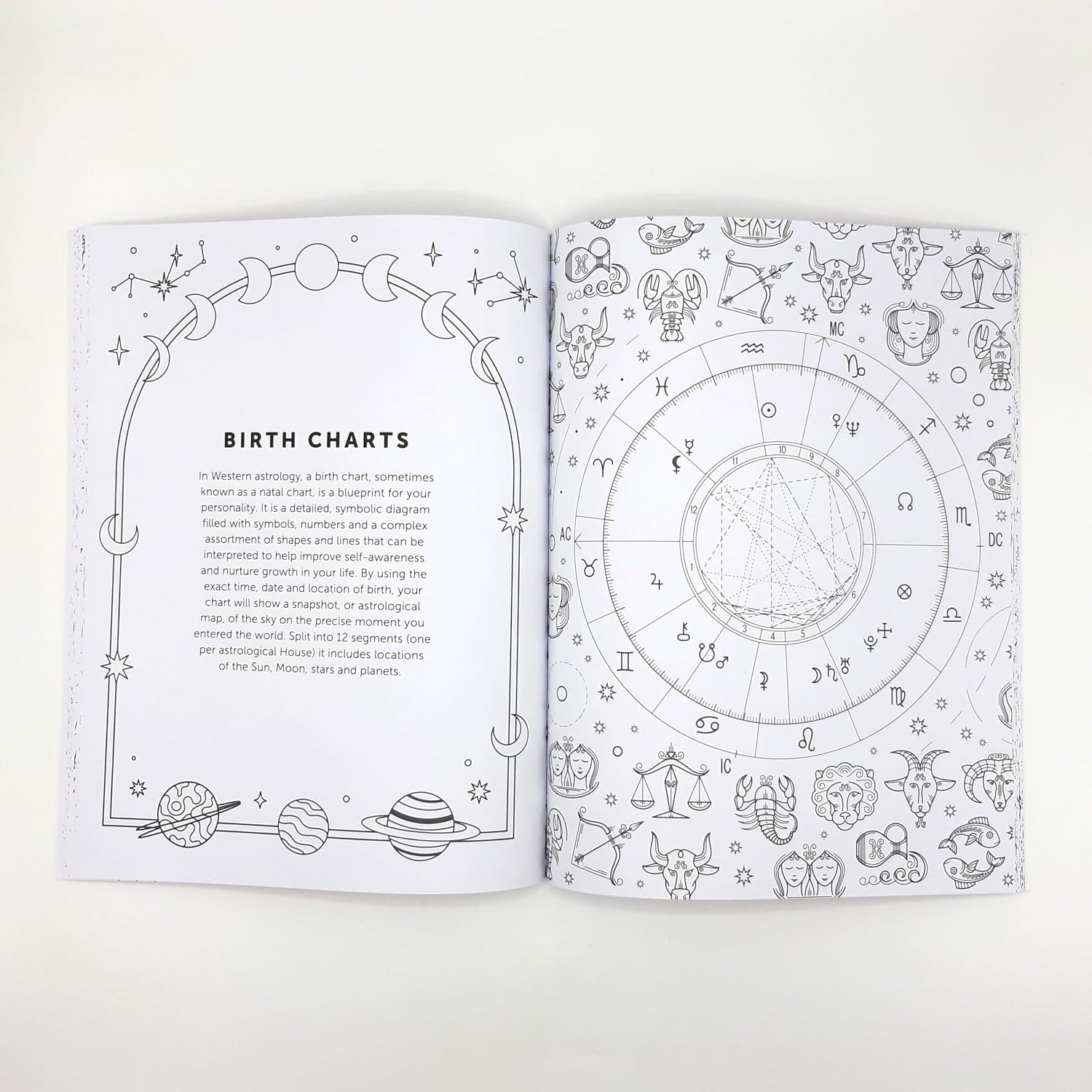 Discover interstellar illustrations and insightful quotes as you turn the pages and delve into the ancient art of astrology. Read about zodiac signs from around the world, astrological houses and how to interpret birth charts and celestial bodies while you fill in captivating images and intricate designs.