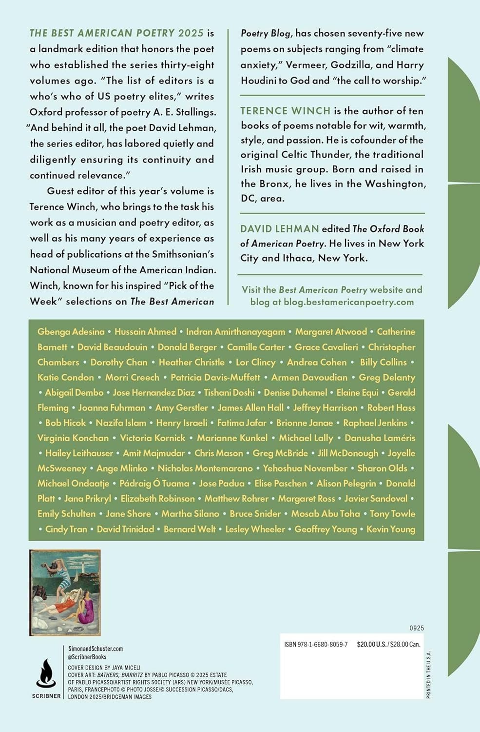Guest edited by Terence Winch—NEA Fellow and editor of the “pick of the week” on the Best American Poetry blog—the 2025 edition marks a poignant farewell to series editor David Lehman, celebrating more than three decades of poetic excellence.