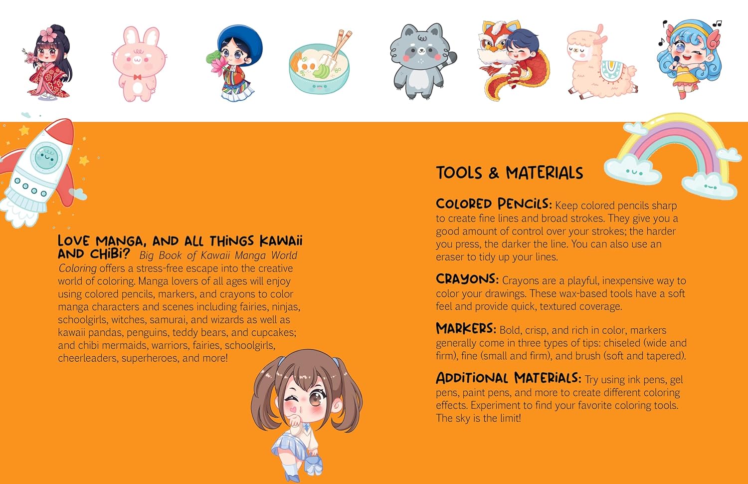 With over 130 illustrations to color on high-quality perforated paper, Big Book of Kawaii Manga World Coloring will have your imagination soaring as you add color to your favorite kind of art. Add your own touch to a buzzing bee, a happy rainbow, a sleepy bear, and a super-fluffy llama, along with a kawaii witch, a butterfly fairy, and some fun sharks. Color your way through cute donuts, magical elves, and much more! In this adorable, magical universe, you’ll meet: