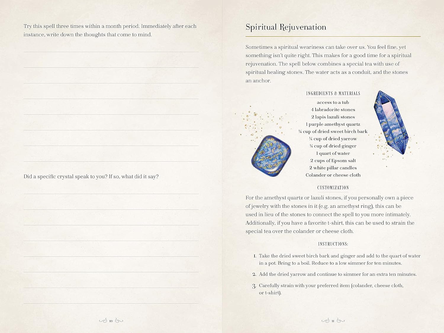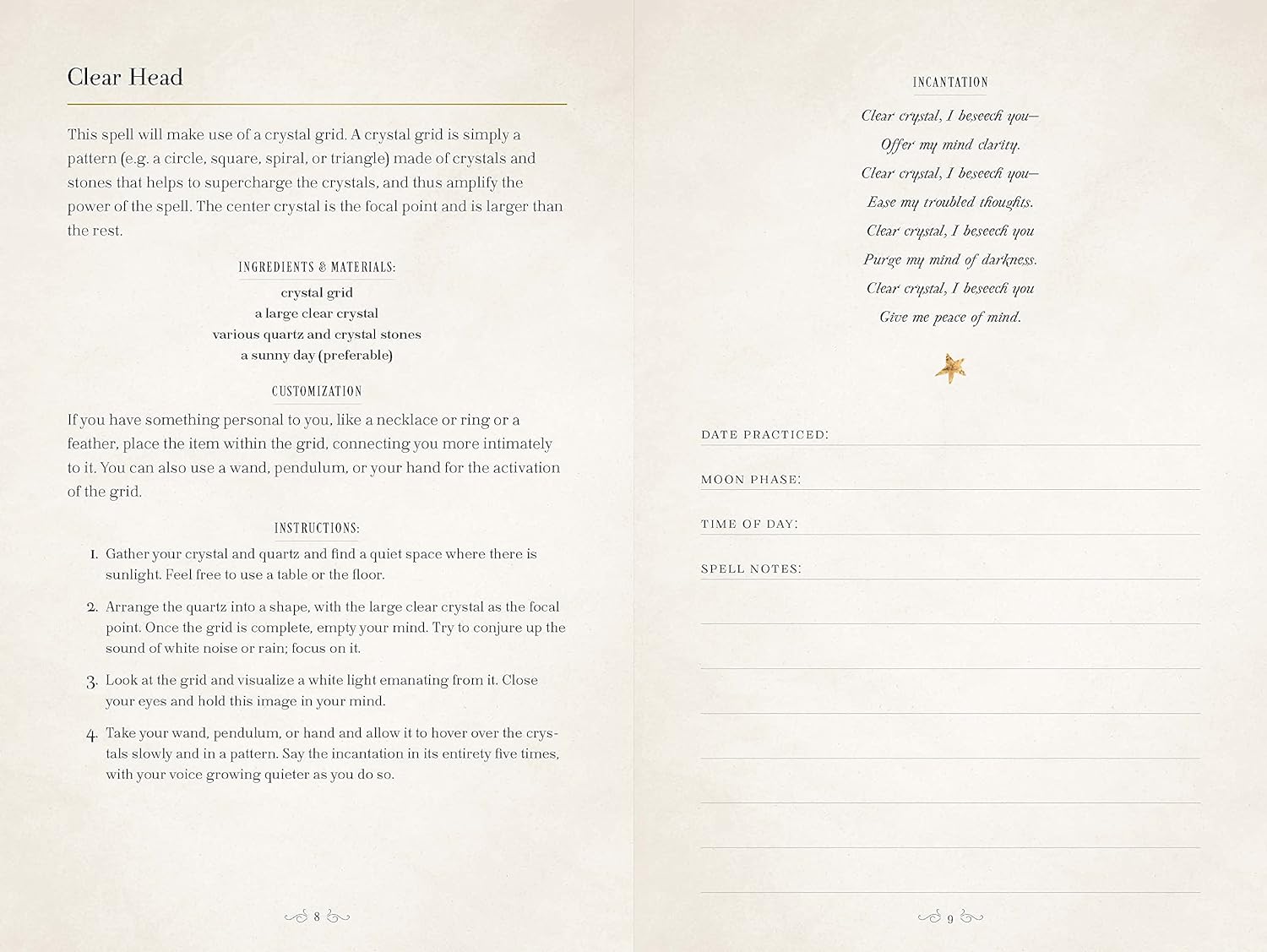 - For each spell, a section to record all the details about the spell, followed by reflective journal prompts to give more insight into your intentions, hopes, and wishes for spellcasting