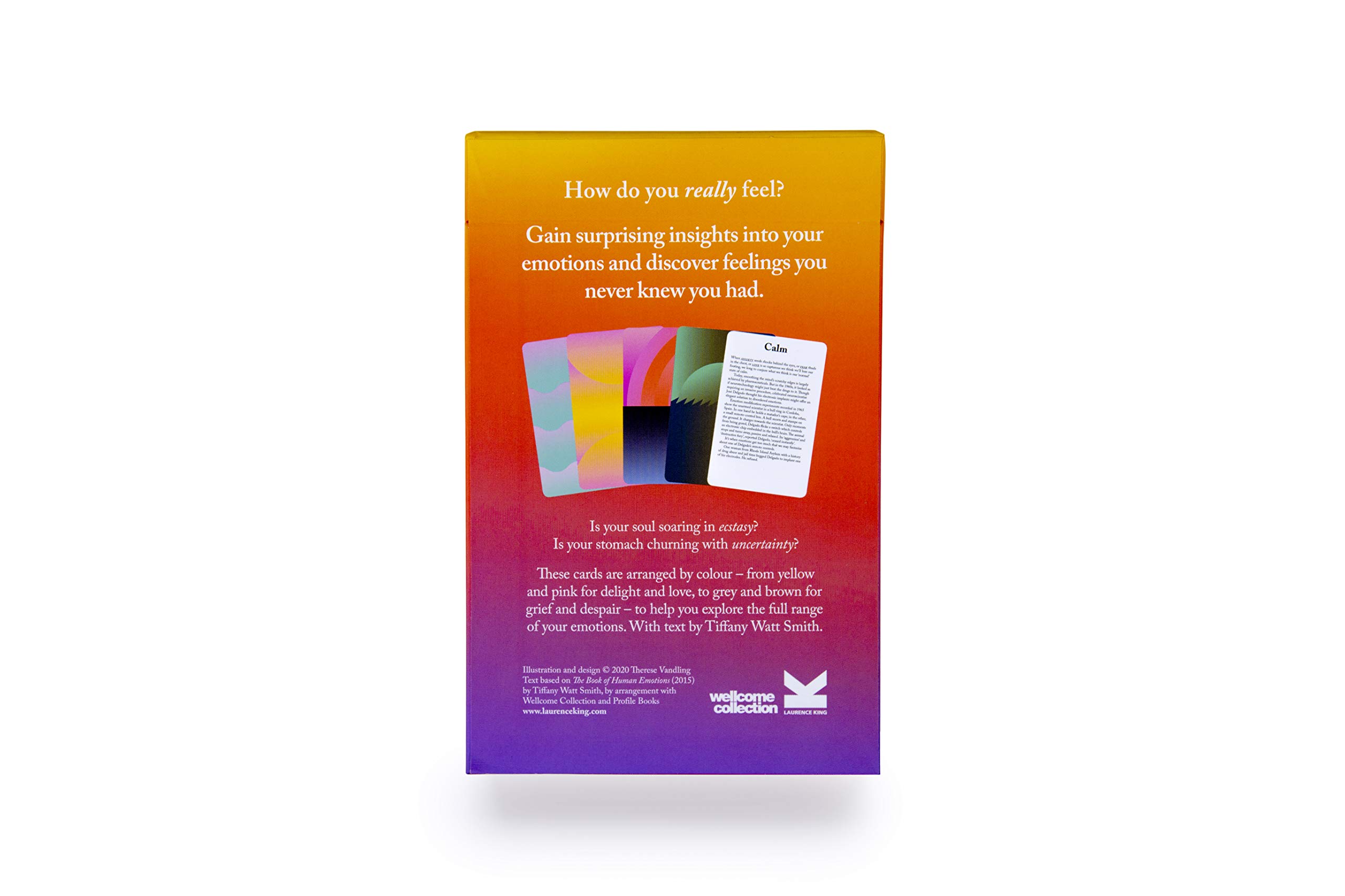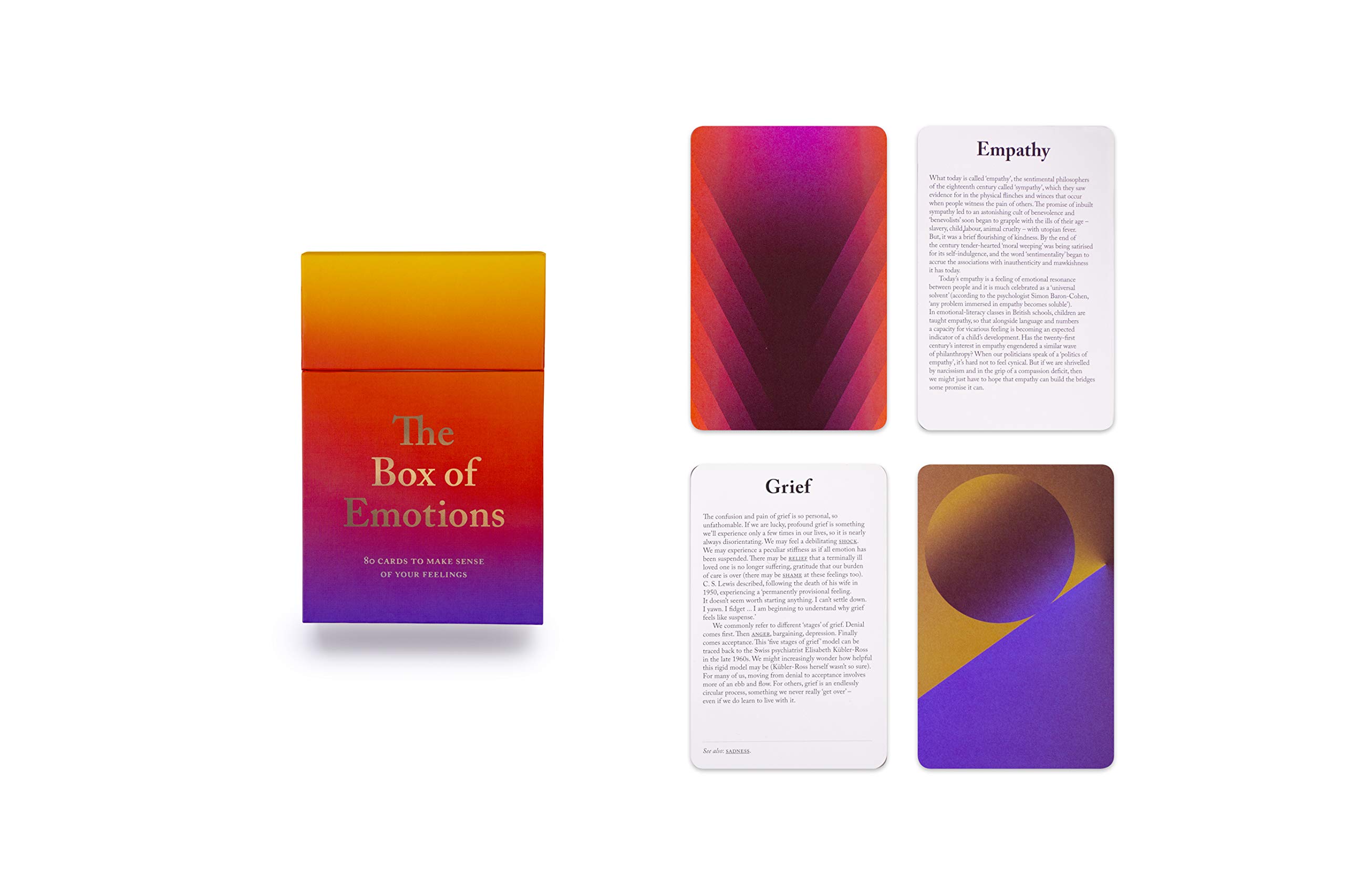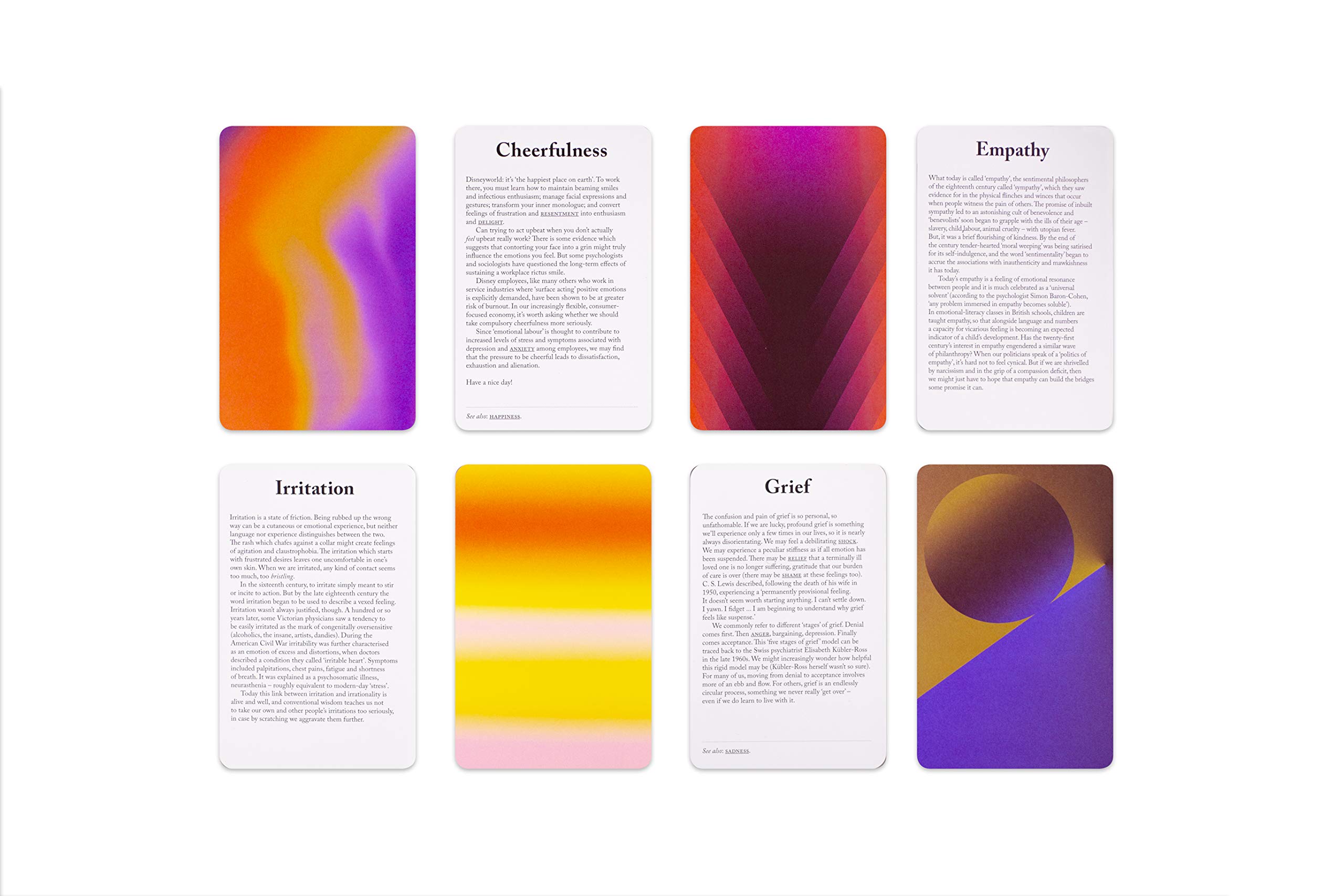 Each of the 80 cards contains a mini-essay on a different emotion on one side and a mesmerizing colour pattern on the other. Learn more about yourself and what makes your fellow beings tick, from anger and worry to empathy and courage. And with a host of less familiar emotions – dépaysement, fago, and litost among them – you may discover a whole new way of being.