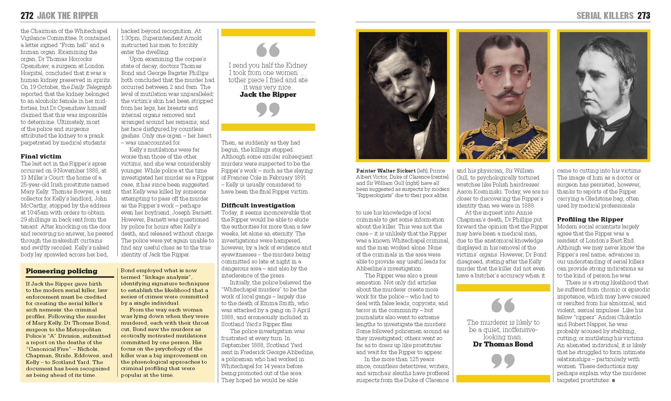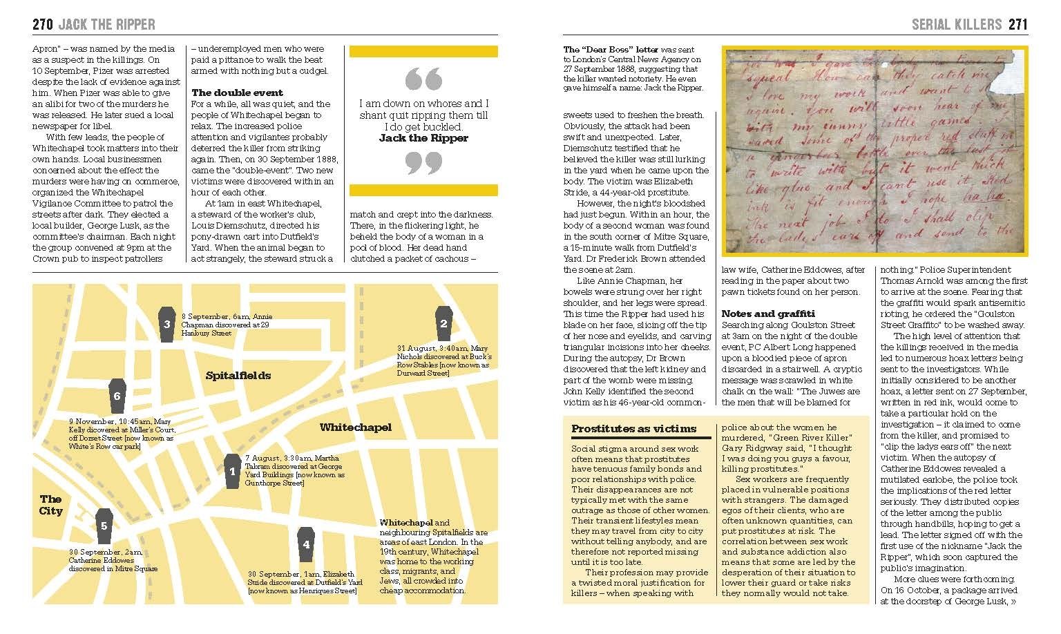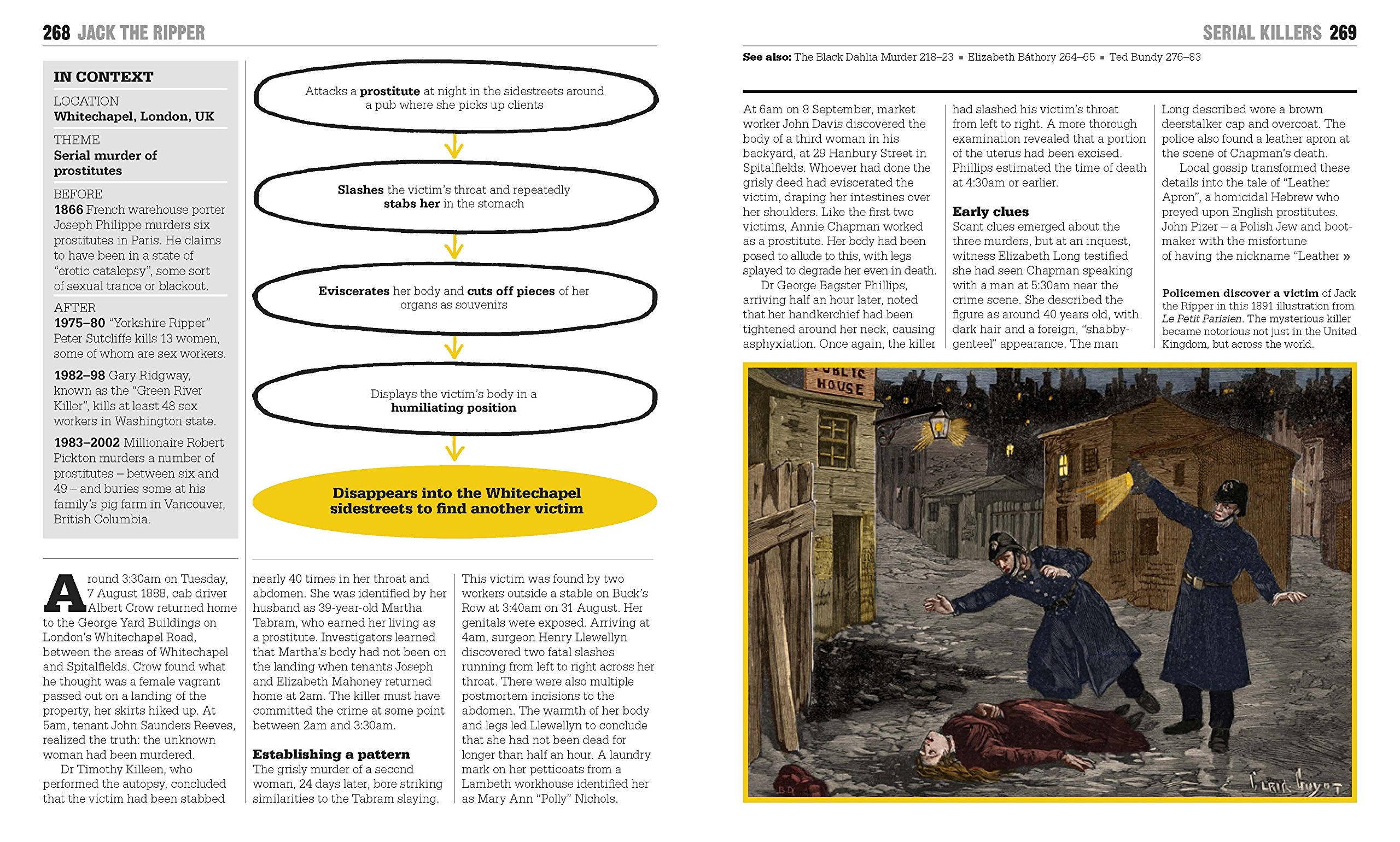 The Crime Book looks at the big ideas and concepts in criminology spanning from pirates, kidnapping and political plots to modern con artists, serial killers and rogue traders, including the Black Dahlia investigation, the Mississippi Scheme, and the notorious Jeffrey Dahmer.