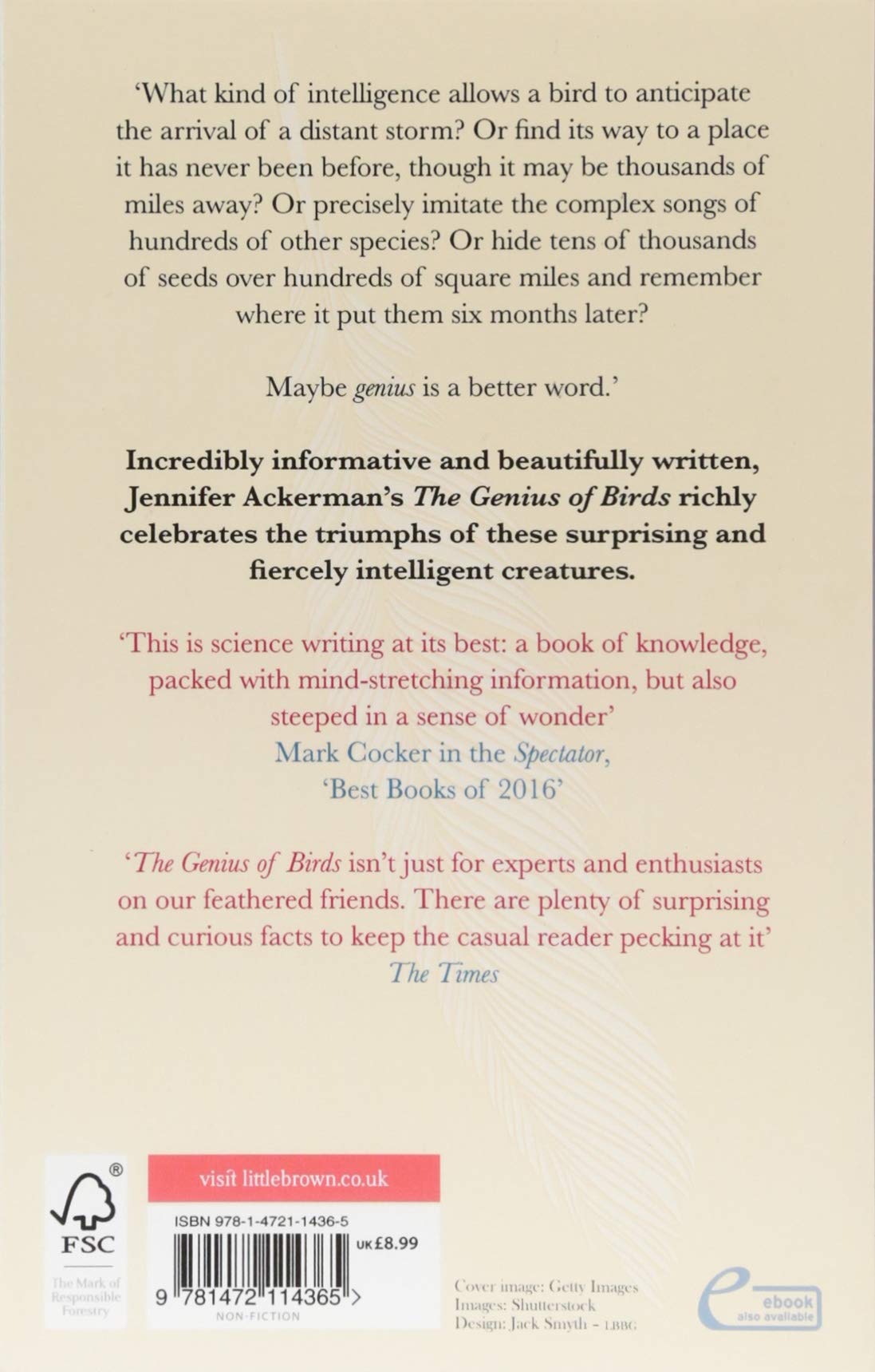 In The Genius of Birds, acclaimed author Jennifer Ackerman explores the newly discovered brilliance of birds and how it came about. As she travels around the world to the most cutting-edge frontiers of research - the distant laboratories of Barbados and New Caledonia, the great tit communities of the United Kingdom and the bowerbird habitats of Australia, the ravaged mid-Atlantic coast after Hurricane Sandy and the warming mountains of central Virginia and the western states - Ackerman not only tells the story of the recently uncovered genius of birds but also delves deeply into the latest findings about the bird brain itself that are revolutionizing our view of what it means to be intelligent.
