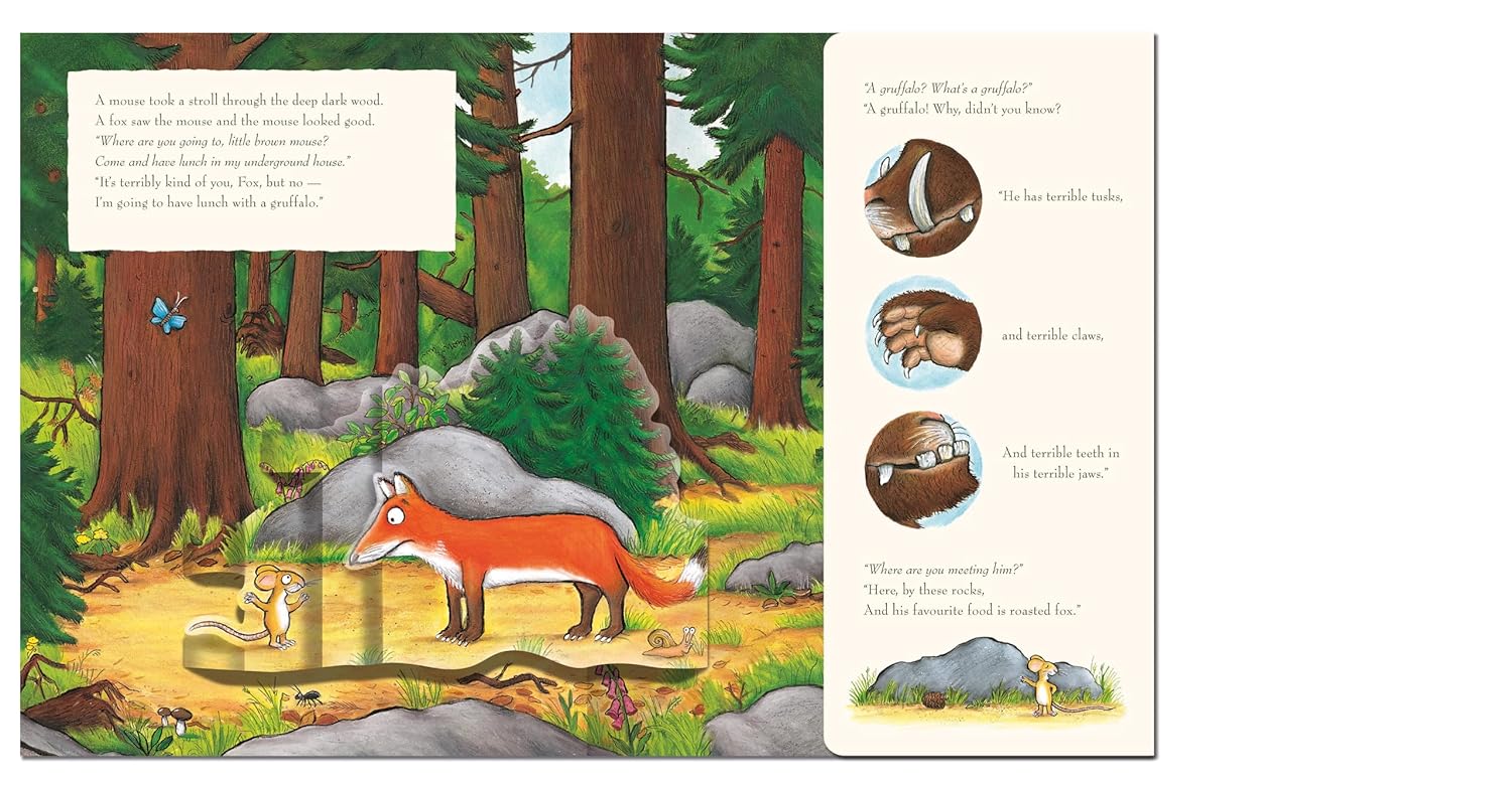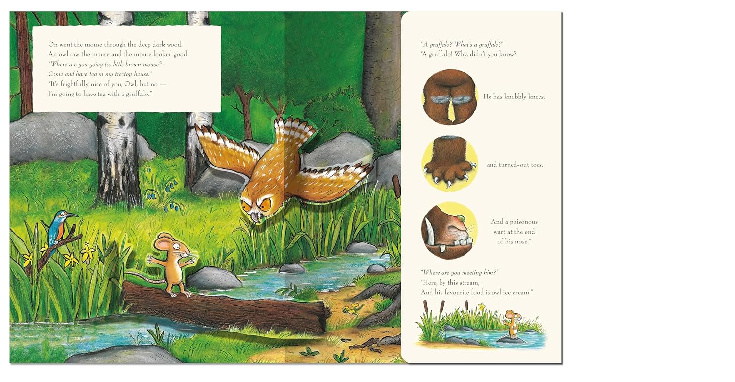 Read the classic story and discover what happens when a quick-witted mouse comes face to face with an owl, a snake . . . and a hungry gruffalo! The story is brought to life by incredible pop-up scenes and characters, including a huge 3D Gruffalo.