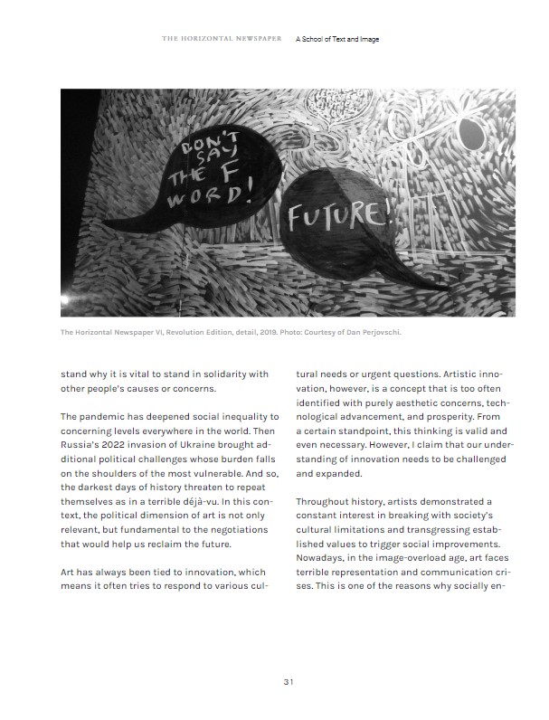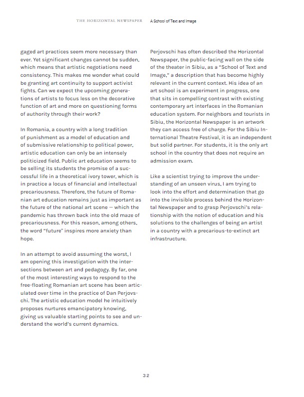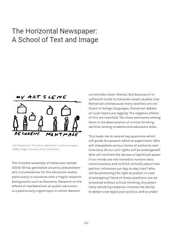 The Horizontal Newspaper has evolved into a “place in time” that neither spares us our biases nor allows us to sink in despair. A fixed point from where Perjovschi has been conveying meaning for over a decade and an active space of freedom, self-determination, solidarity, and coherence.