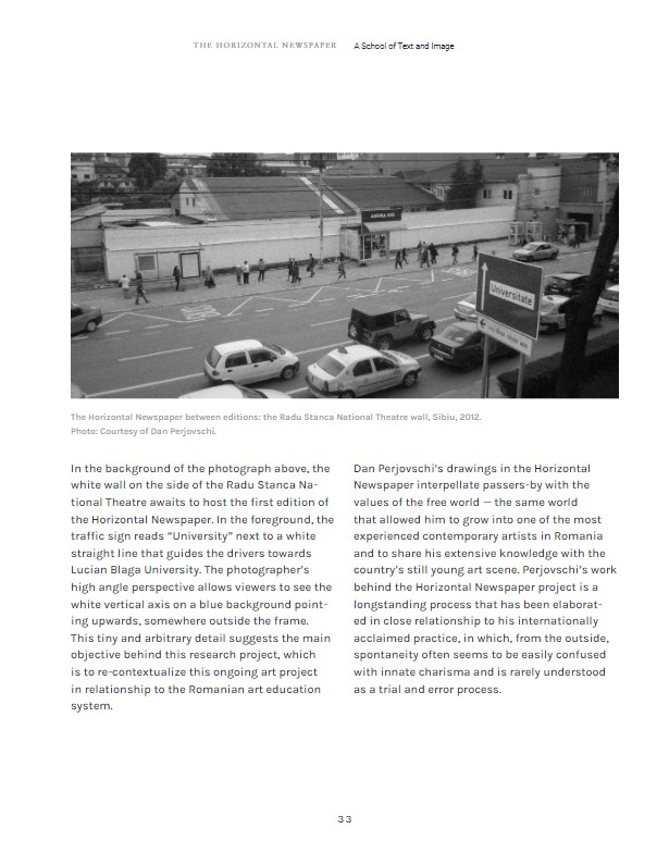 The Horizontal Newspaper, the classroom with a single wall, neither discriminates nor closes its eyes to discrimination. Furthermore, as an artistic experiment, it refutes double standards. What Perjovschi delivers to his international audience through the Western art scenes, he also provides to the eyes of anyone who walks along the Coposu Boulevard in Sibiu city.