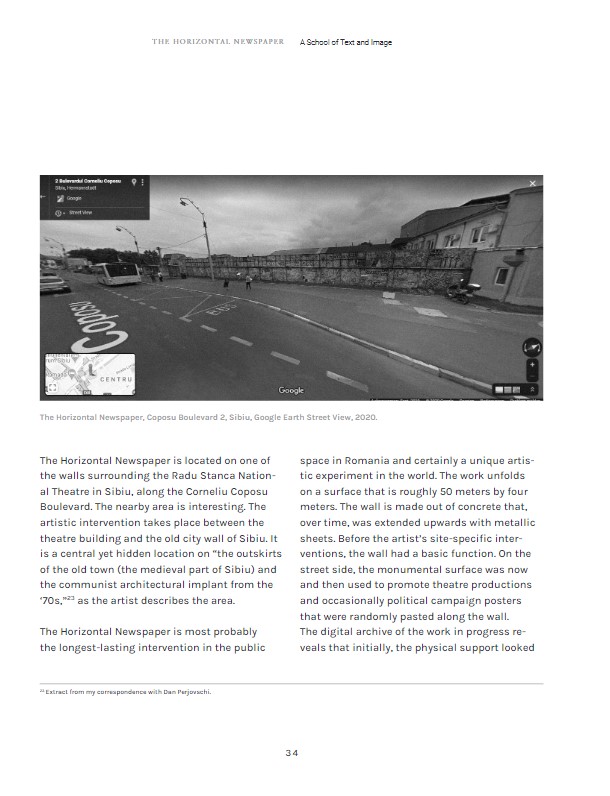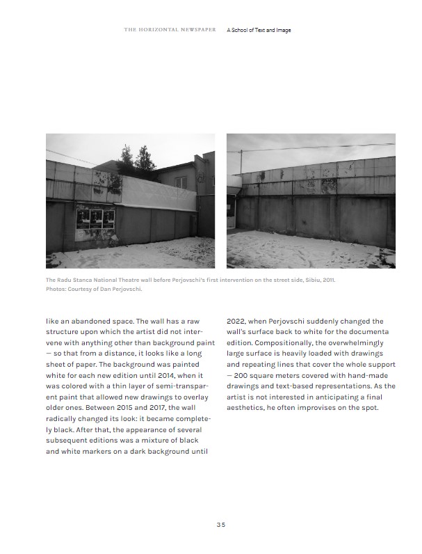 The Horizontal Newspaper is most probably the longest-lasting intervention in the public space in Romania and certainly a unique artistic experiment in the world. The work unfolds on a surface that is roughly 50 meters by four meters.