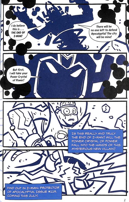 Our heroes have but one choice: continue Z-Man’s legacy by writing and illustrating THEIR OWN COMIC BOOK! Step one? Knock off their beloved Z-Man and cast themselves as super rad, super goofy, superhero protectors of the mysterious city of Apocalyptia. What could possibly go wrong? Just about everything!