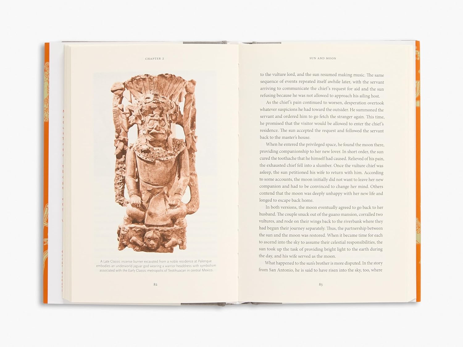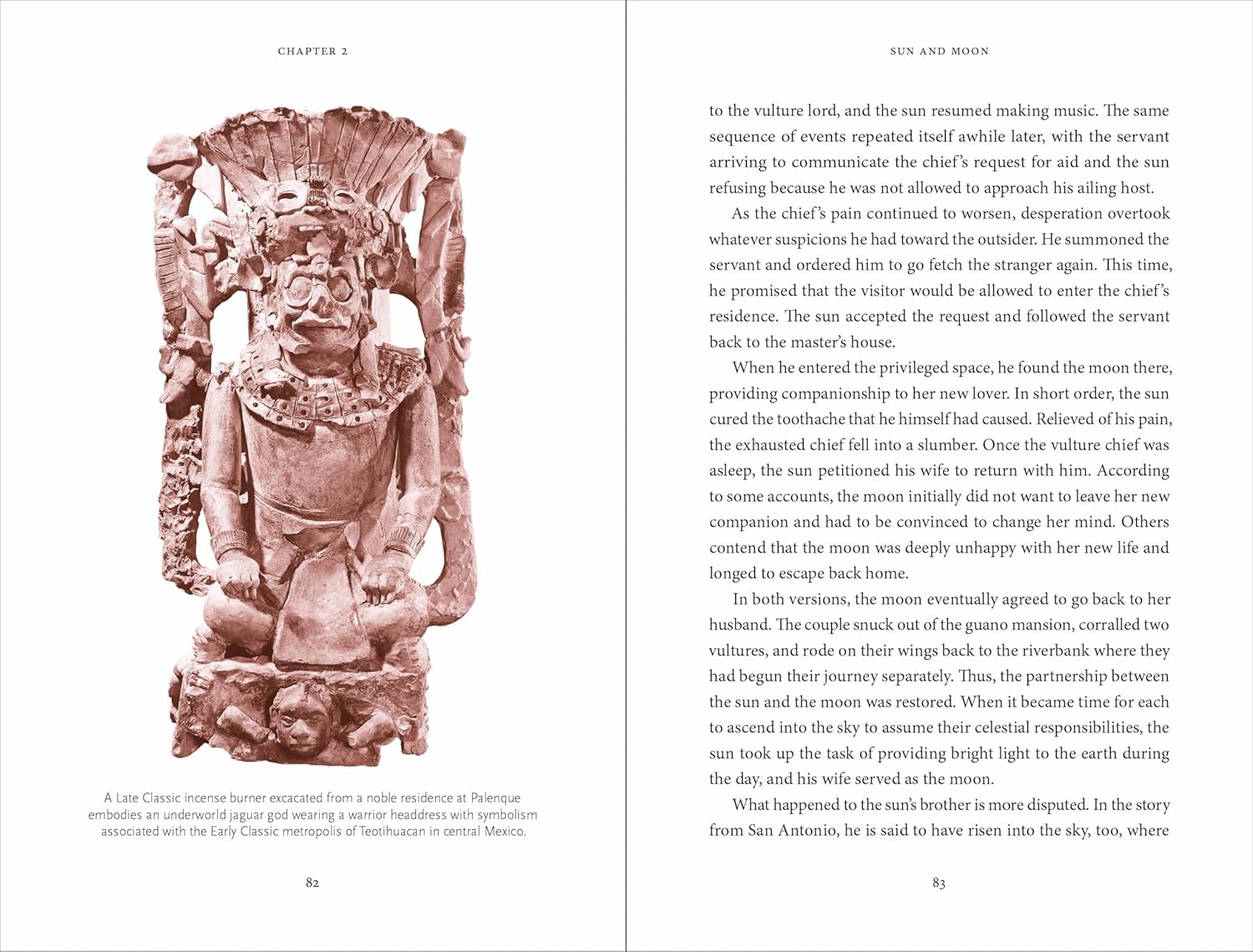 Highly complex and divided into politically fragmented noble houses, the Maya civilization produced a diverse and complicated mythology that varies between groups and retellings. For example, there are three different myths about the origins of the sun and moon, in one creation myth animals and objects rise up to torment humanity; whilst in another, pots shatter and speak, unleashing demons upon the people.