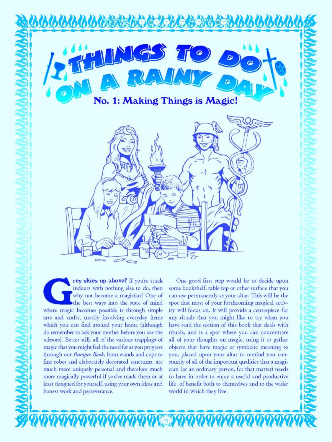 Its contents include profusely illustrated instructional essays upon this ancient sect’s theories of magic, notably the key dissertation “Adventures in Thinking,” which gives reliable advice as to how entry into the world of magic may be readily achieved. Further to this, a number of “Rainy Day” activity pages present lively and entertaining things to do once the magical state has been attained, including such popular pastimes as divination, etheric travel, and the conjuring of a colourful multitude of spirits, deities, dead people, and infernal entities from the pit, all of whom are sure to become your new best friends.