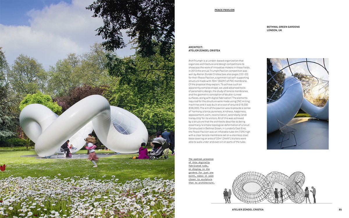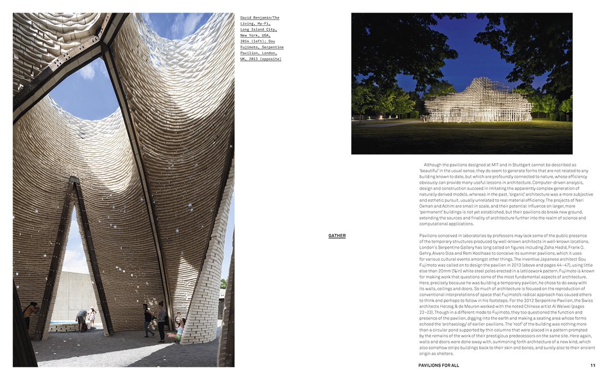 This is a selection of the best examples produced in recent years. From the cutting- edge forms of Sou Fujimoto to Zaha Hadid’s Chanel pavilion, from small structures created entirely out of farm waste to a mirrored carapace conceived by Olafur Eliasson, each pavilion featured provides a lesson in the extreme possibilities of built form and demonstrates that many of the biggest ideas in architecture start small.