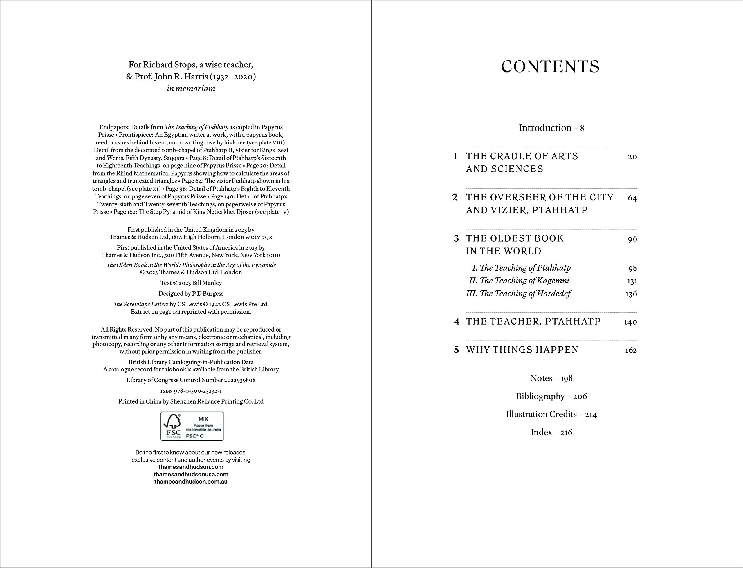 Manley introduces Ptahhatp, who served as Vizier to the Old Kingdom pharaoh Izezi (c. 2410–2375 BC), and the world of dynamic ideas and new technologies – writing among them – within which he worked, illuminating the nuances of his language and philosophy. In addition, Manley’s new translation of Why Things Happen, the oldest surviving account of creation from anywhere in the world, reveals how Ptahhatp’s account of the human condition is founded in distinctive ancient Egyptian beliefs about the nature of truth and reality. Taken together, Manley’s new translations and expert commentary provide a new perspective on the Pyramid Age and overturn traditional prejudices about the origins of writing and philosophy. The ‘oldest book in the world’ is a testament to a common thread that connects humanity across time; Ptahhatp grapples with the pitfalls of greed, ambition, celebrity, success, confrontation, friendship, sex and even the office environment, and his teachings remain remarkably relevant in the modern day.
