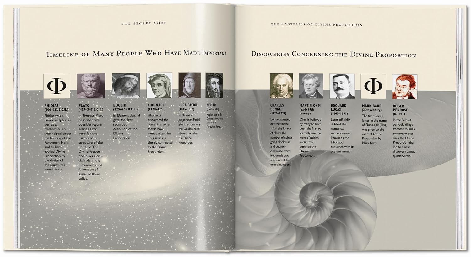 This book deals with the Divine Proportion, a secret code that rules art, nature, and science. It is known by many names: Golden Mean, Sacred Cut and Phi are only a few; and it is not by chance that the Divine Proportion was given its name. It has been called divine because over thousands of years it has been deemed to be so.
