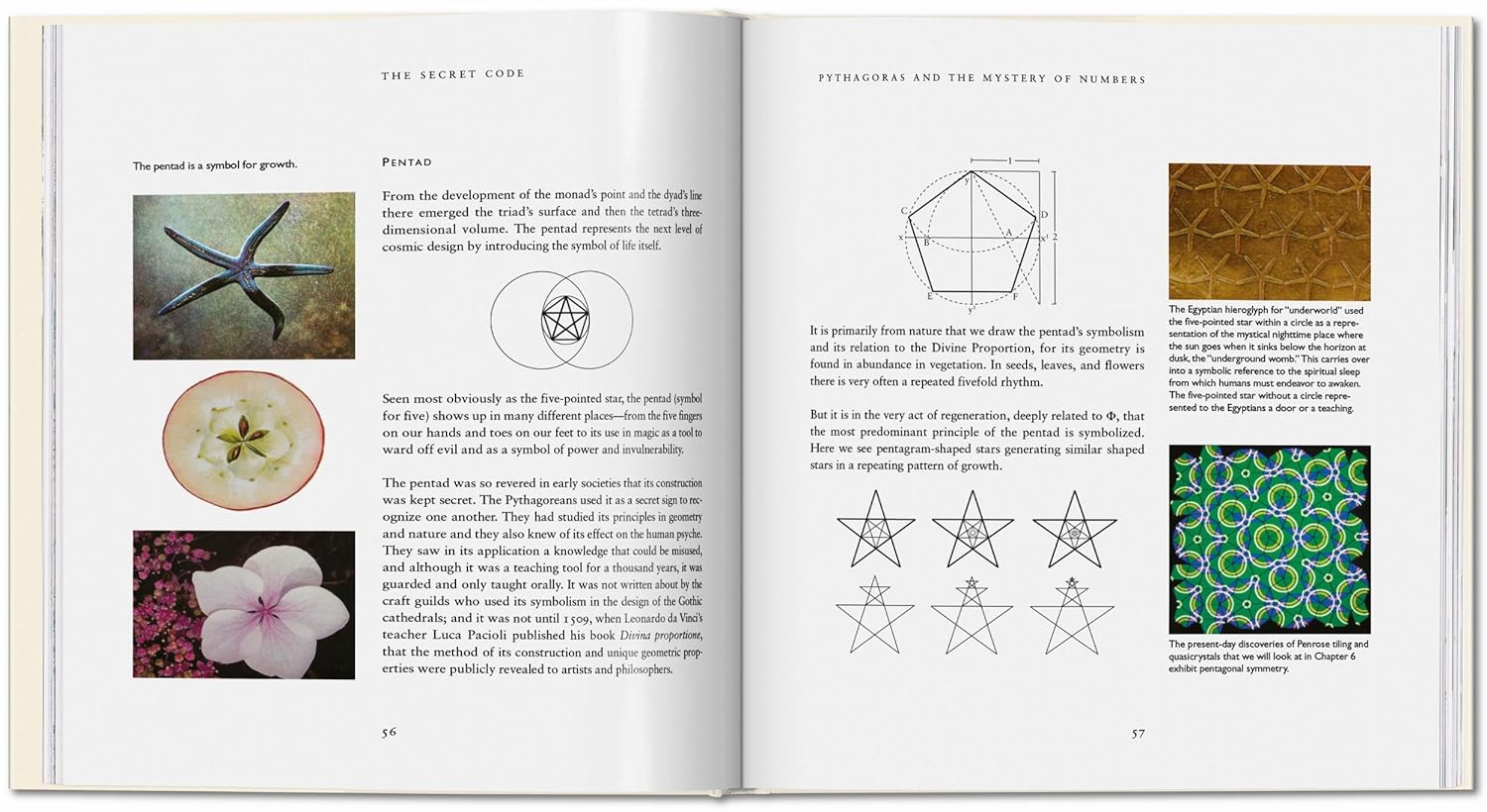 The Divine Proportion reveals a number of simple patterns: It is seen in the seed patterns of fruits, the family tree of bees, the pyramids of Egypt, Gothic cathedrals, Renaissance paintings, the human body, shells ... the list is endless.