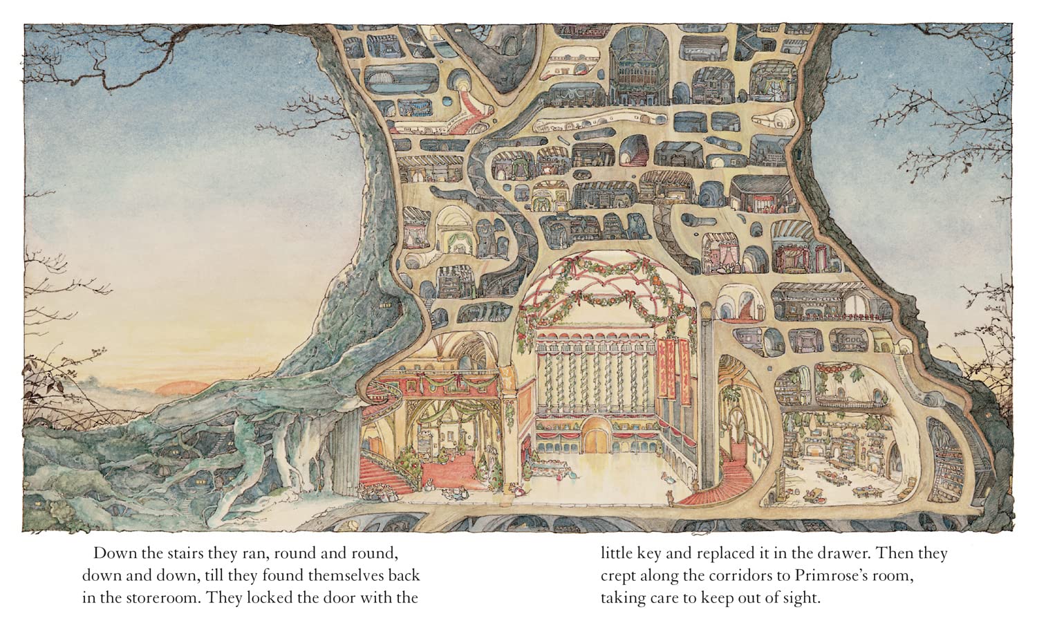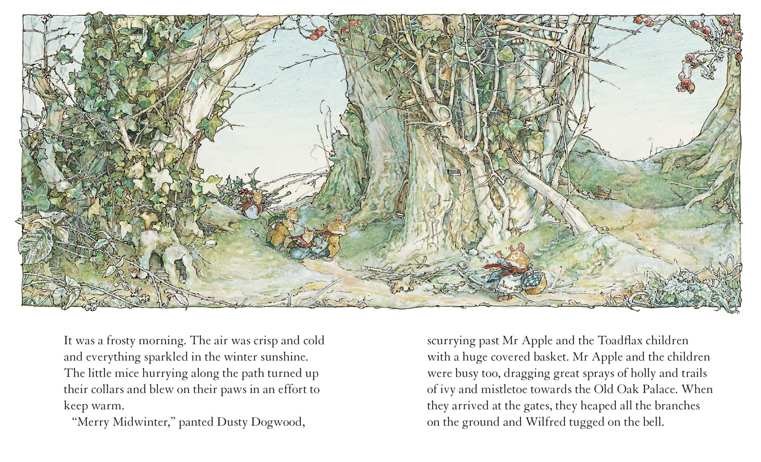 It is Midwinter's Eve and the mice of Brambly Hedge are very busy. This evening, after dark, they will all be gathering round a blazing fire for the traditional midwinter celebrations. A grand entertainment is planned and Primrose and Wilfred have chosen to recite a poem.