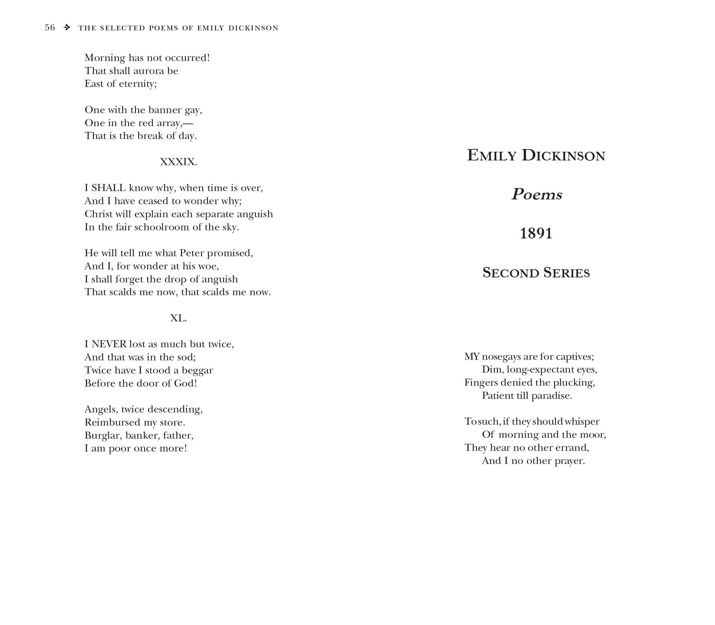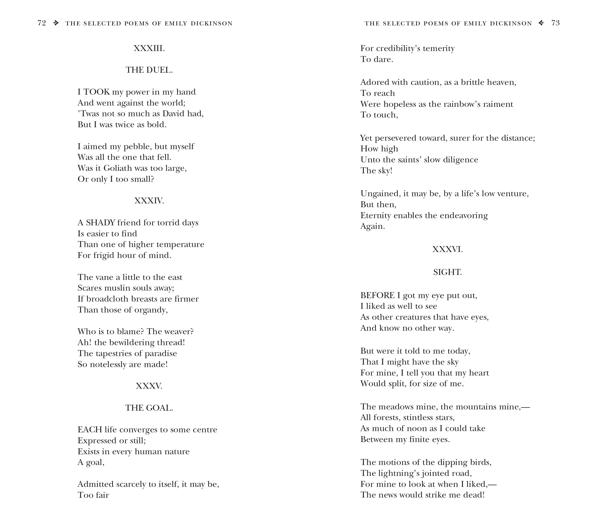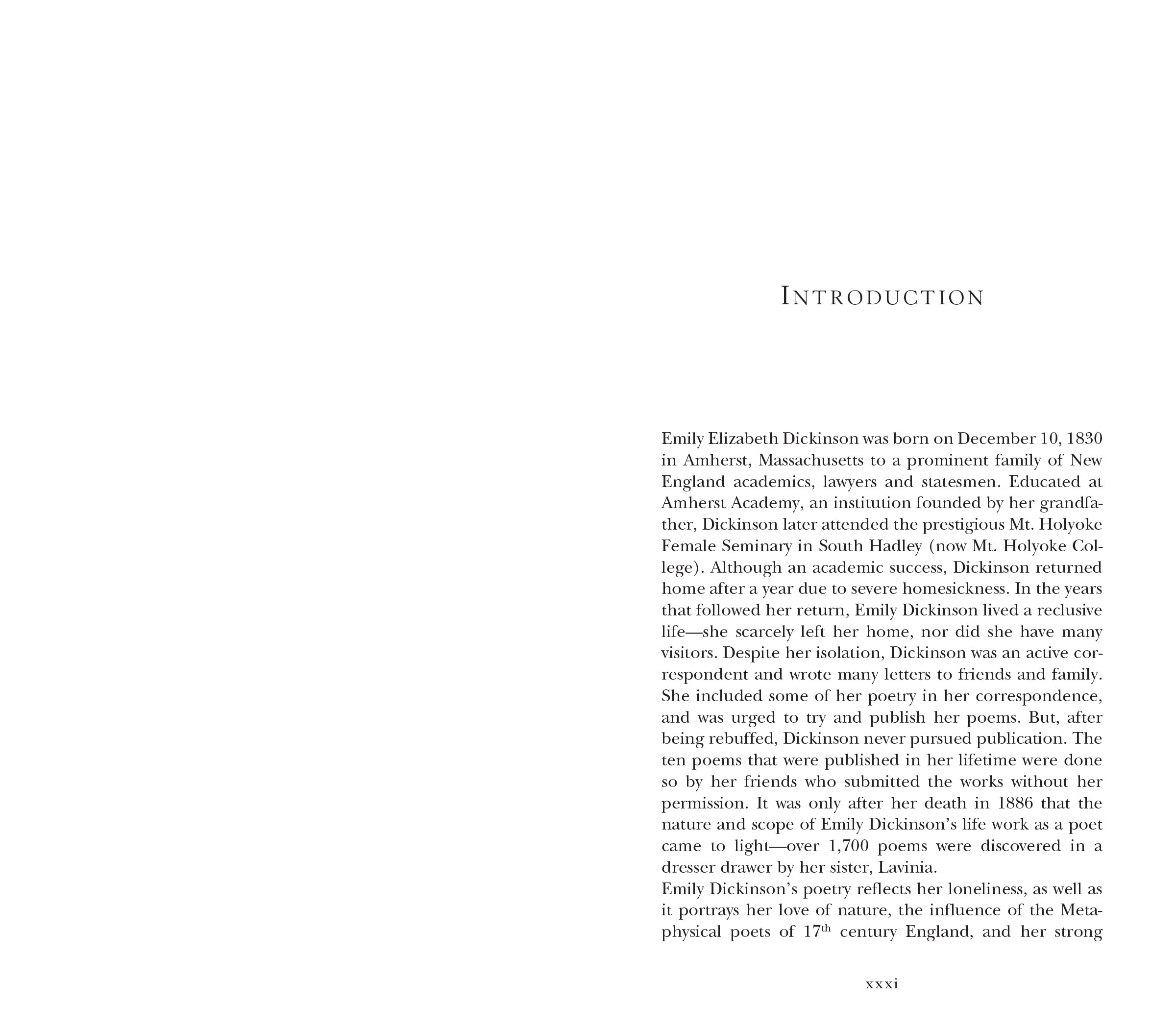 Born in 1830 in Amherst, Massachusetts, to a prominent New England family and educated at Amherst Academy and Mt. Holyoke Female Seminary, Emily Elizabeth Dickinson lived most of her life in seclusion, devoted to writing. She scarcely left home, nor did she have many visitors. Only ten of her poems were published in her lifetime, submitted without her permission by friends. It was only after her death in 1886 that the scope of her work as a poet came to light—over 1,700 poems were discovered in a dresser drawer by her sister, Lavinia.