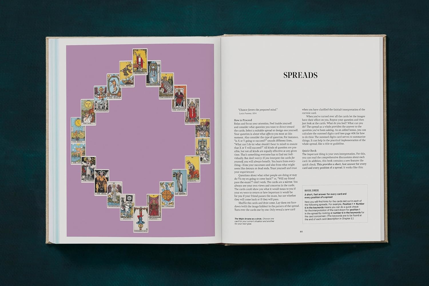 All 78 cards are presented individually and in detail. The explanatory texts provide several dimensions and levels of interpretation, including concrete practical tips. Further, the book offers a new feature: the quick check. This presents a concise hint regarding the meaning of each card in each possible position of all the spread patterns featured in the book.