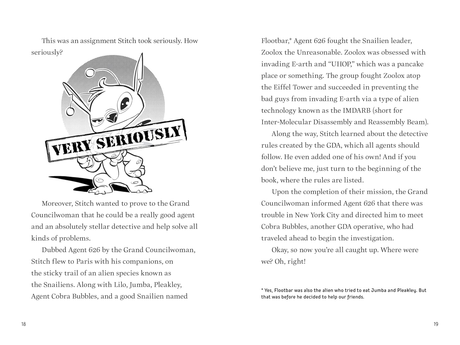 After saving Paris from a Snailien invasion, Stitch and his friends are off to the big apple. People have been disappearing all over New York City, and the Galactic Detective Agency suspects that a group of shapeshifting aliens are to blame. Now it is up to Stitch to figure out what has happened to the missing people and save the day. But how do you a solve a mystery when the suspects can disguise themselves to look like anyone, maybe even your best friends?