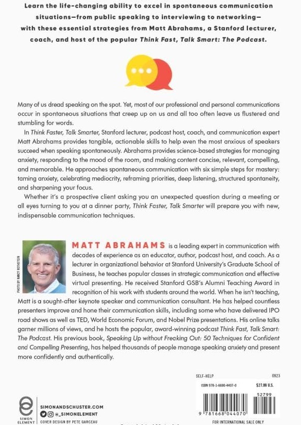 In Think Faster, Talk Smarter, Stanford lecturer, podcast host, and communication expert Matt Abrahams provides tangible, actionable skills to help even the most anxious of speakers succeed when speaking spontaneously. Abrahams provides science-based strategies for managing anxiety, responding to the mood of the room, and making content concise, relevant, compelling, and memorable. Drawing on stories from his clients and students, he offers best practices for navigating Q&A sessions, shining in job interviews, providing effective feedback, making small talk, fixing faux pas, persuading others, and handling other impromptu speaking tasks.