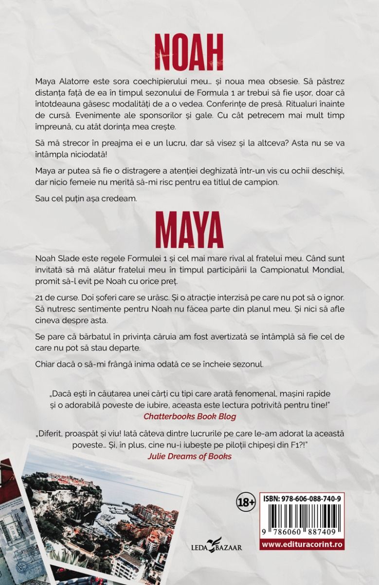 Maya Alatorre este sora coechipierului meu… și noua mea obsesie. Să păstrez distanța față de ea în timpul sezonului de Formula 1 ar trebui să fie ușor, doar că întotdeauna găsesc modalități de a o vedea. Conferințe de presă. Ritualuri înainte de cursă. Evenimente ale sponsorilor și gale. Cu cât petrecem mai mult timp împreună, cu atât dorința mea crește.