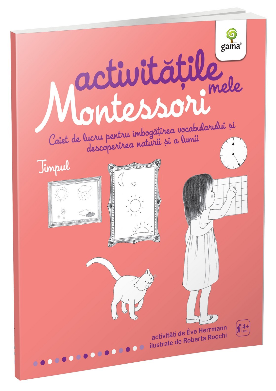 Caietul este structurat în mai multe părți: • Trecut, prezent, viitor • Ziua mea • Săptămâna • Zilele săptămânii • Întâmplări succesive • Banda vârstelor • Aniversarea • Masa anotimpurilor • Jocul anotimpurilor • Vremea • Alege-ți hainele Acest caiet nu doar că îl va învăța pe copil noțiunea timpului, dar îi va dezvolta abilități precum autonomia, perspicacitatea, concentrarea, atenția și motricitatea. Cartea face parte din colecția „Activitățile mele Montessori”, recomandată copiilor de 4-8 ani.
