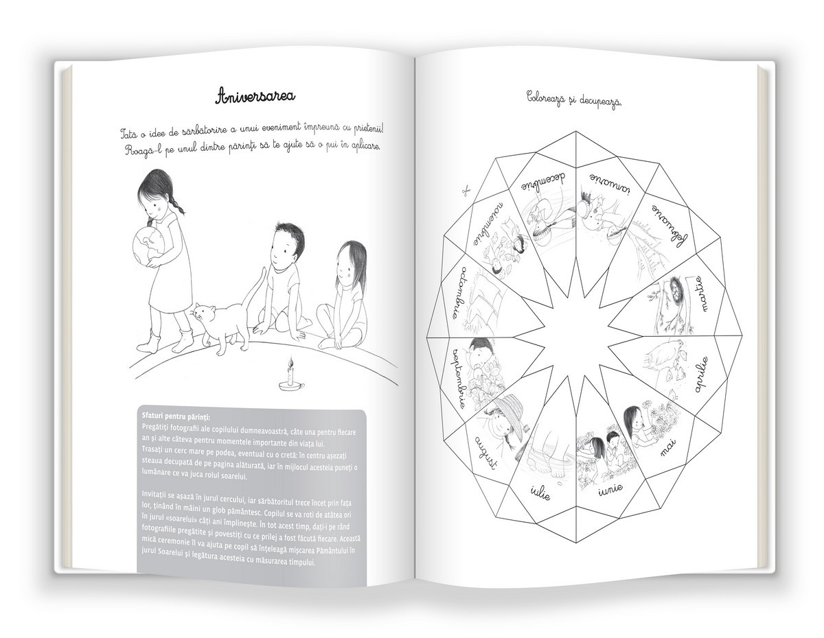 Cu ajutorul activităților propuse, vei putea îndruma copilul să descopere primele noțiuni despre trecerea timpului (momentele unei zile, zilele săptămânii, lunile anului, anotimpurile, starea vremii etc.).