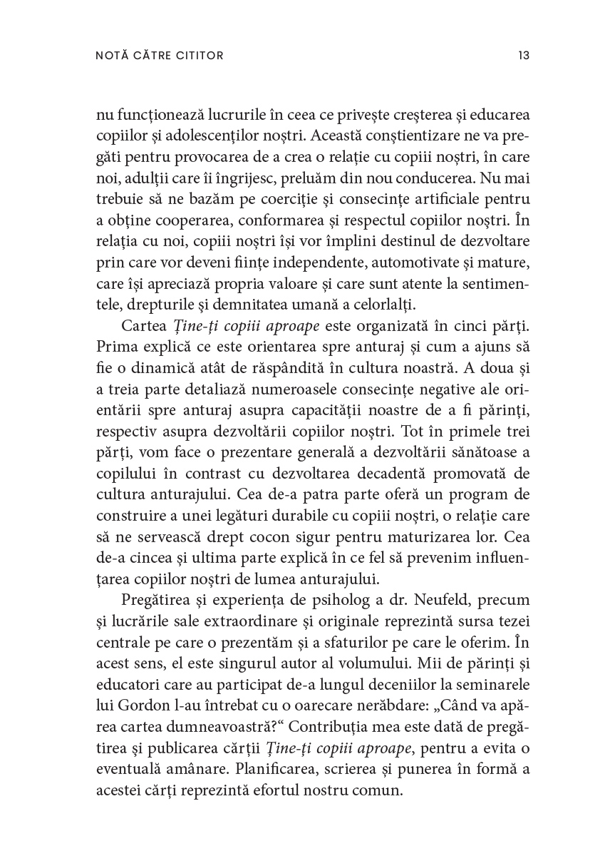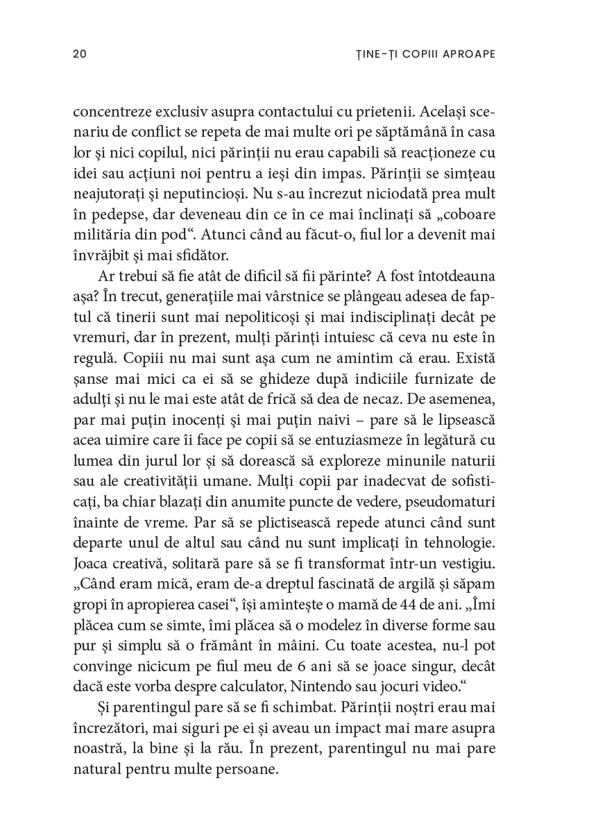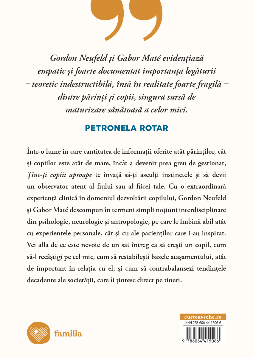 Într-o lume în care cantitatea de informații oferite atât părinților, cât și copiilor este atât de mare, încât a devenit prea greu de gestionat, Ține-ți copiii aproape te învață să-ți asculți instinctele și să devii un observator atent al fiului sau al fiicei tale. Cu o extraordinară experiență clinică în domeniul dezvoltării copilului, Gordon Neufeld și Gabor Maté descompun în termeni simpli noțiuni interdisciplinare din psihologie, neurologie și antropologie, pe care le îmbină abil atât cu experiențele personale, cât și cu ale pacienților care i-au inspirat. Vei afla de ce este nevoie de un sat întreg ca să crești un copil, cum să-l recâștigi pe cel mic, cum să restabilești bazele atașamentului, atât de important în relația cu el, și cum să contrabalansezi tendințele decadente ale societății, care țintesc direct la tineri.