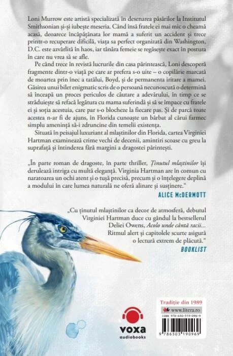„Cufundat în ritmurile luxuriante și umbrele sinistre ale mlaștinilor din Florida, romanul Virginiei Hartman este în același timp un mister captivant, o dramă de familie zguduitoare, o poveste de dragoste și un omagiu la adresa lumii naturale. Loni Murrow este un personaj care-mi va rămâne în suflet multă vreme. Un debut extraordinar.“ LARA PRESCOTT