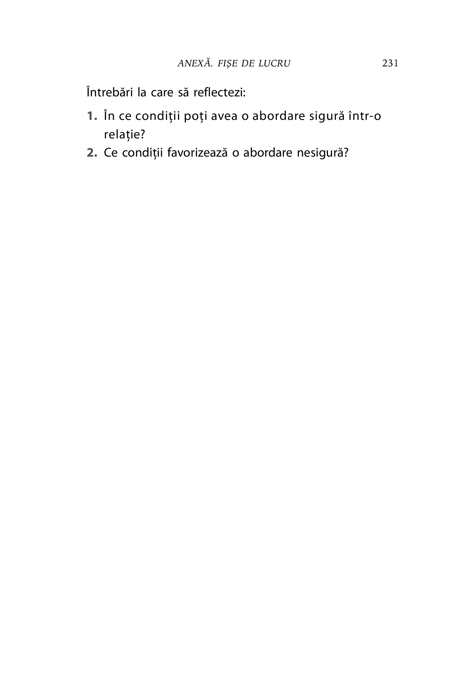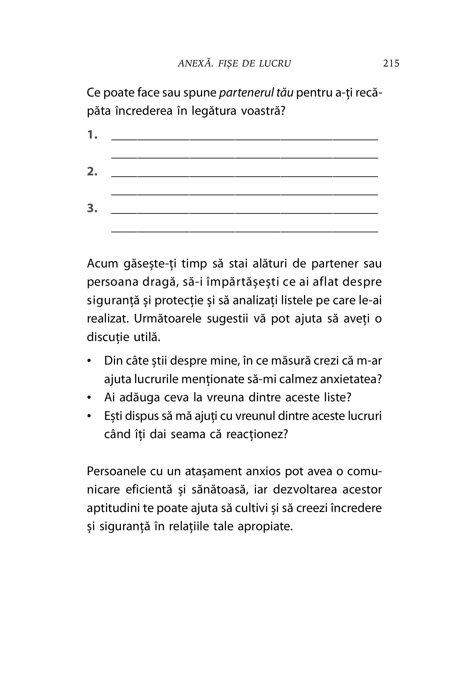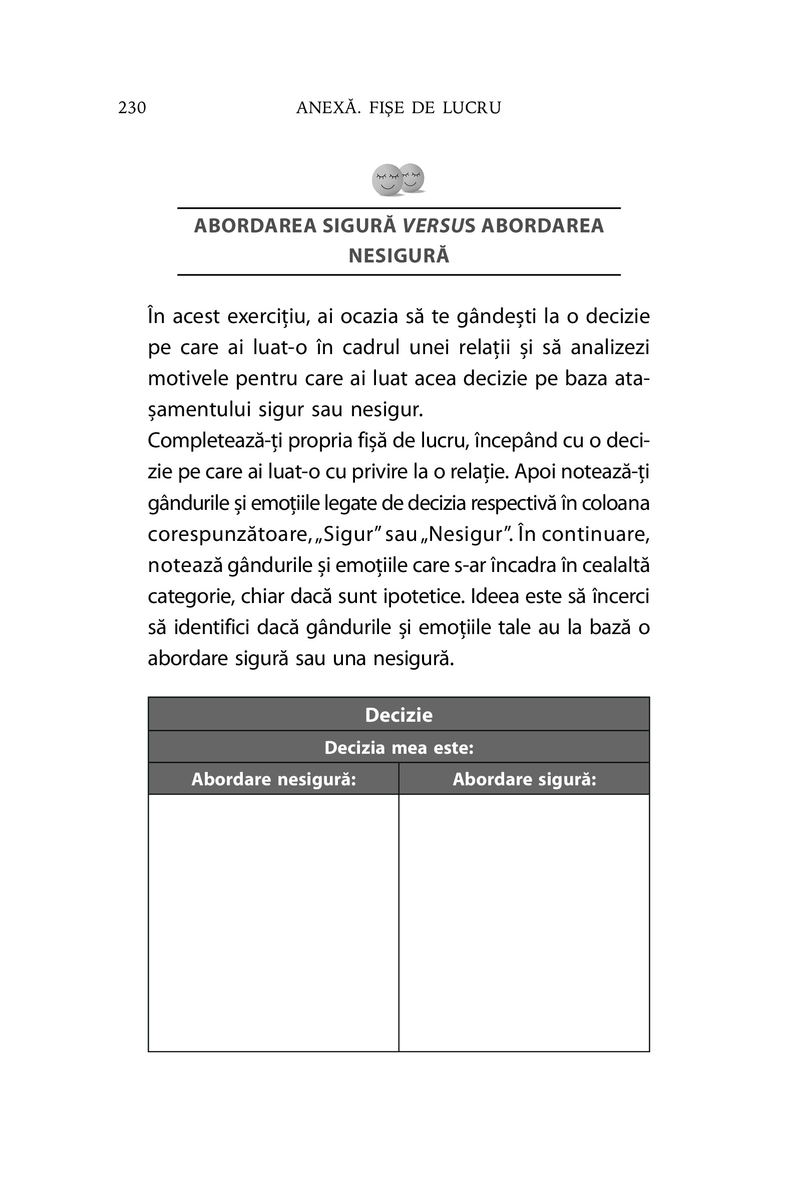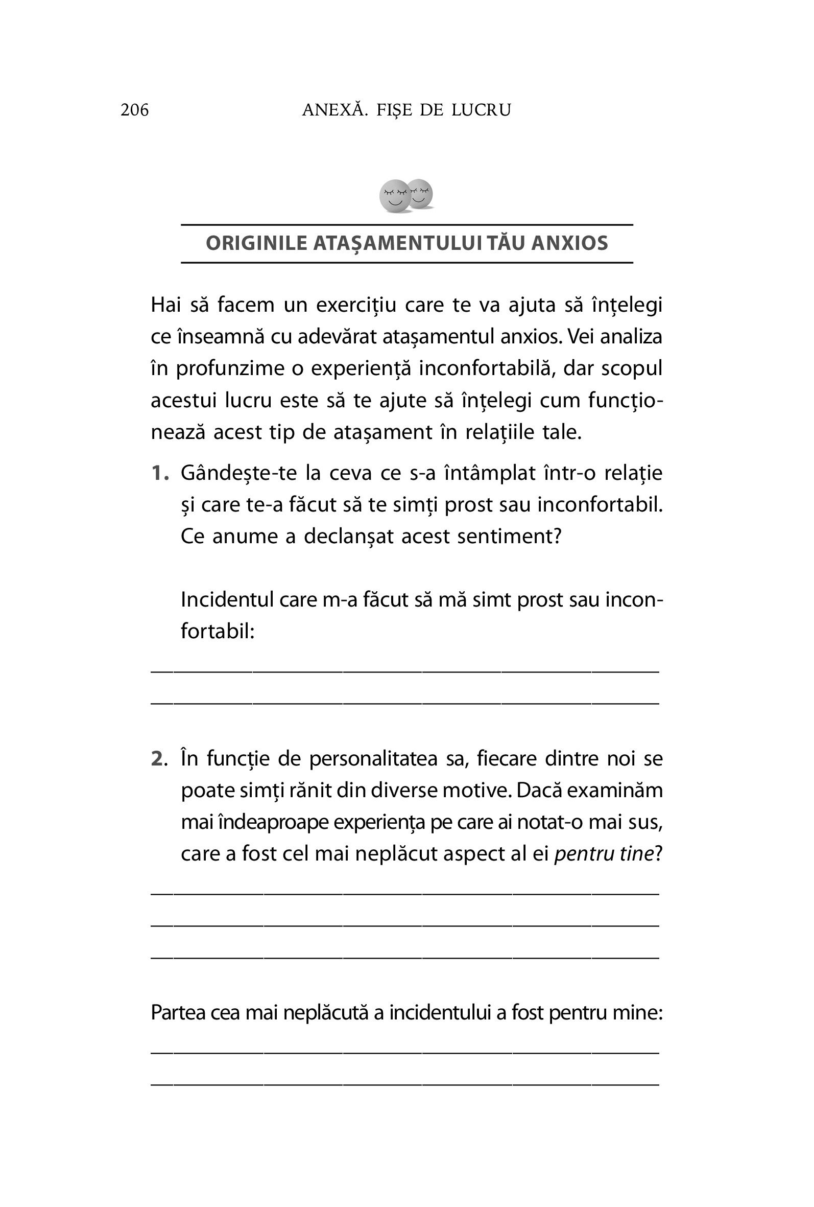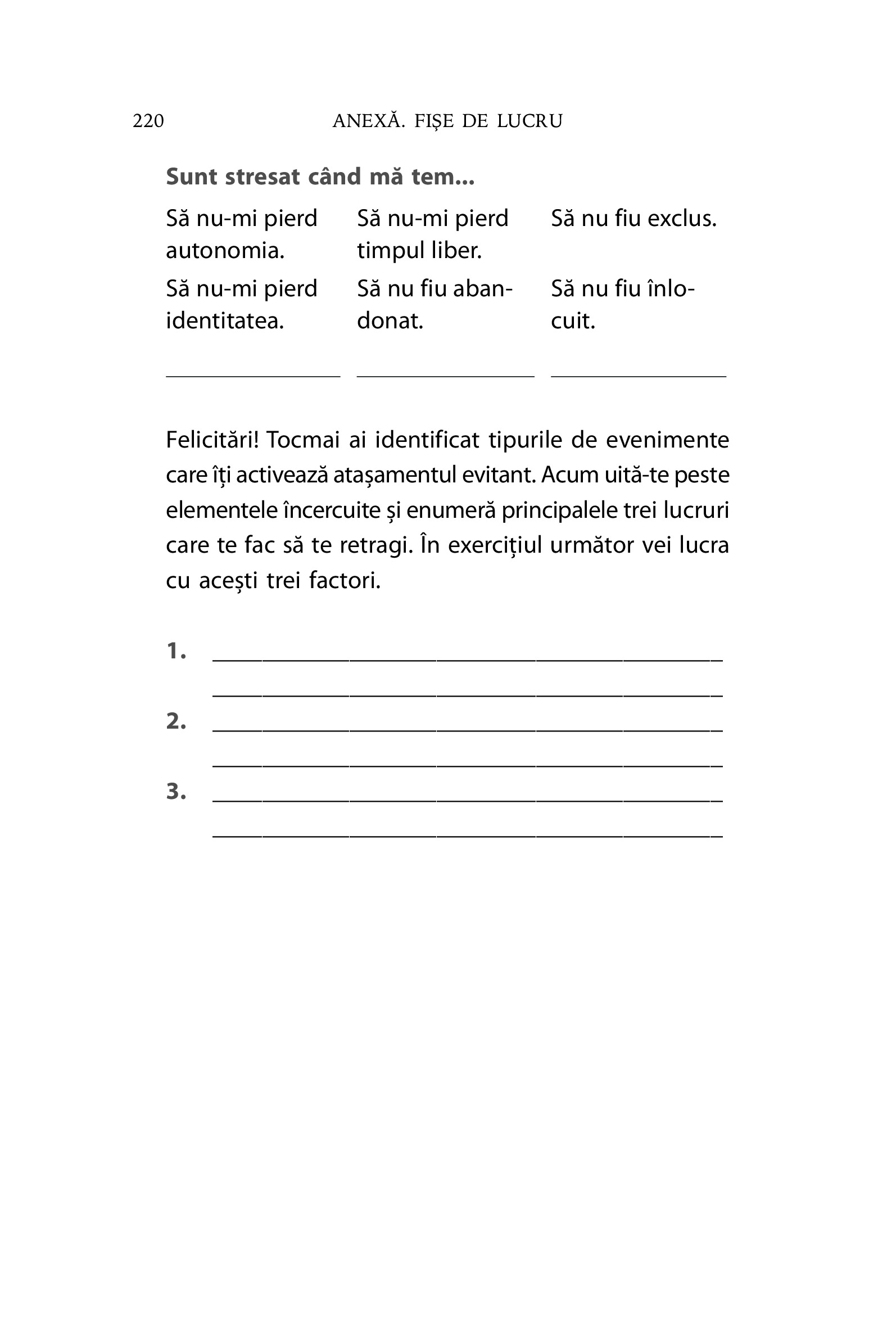 Răspunde la chestionarele din carte, încearcă exercițiile pe care ți le propune autoarea și află care este tipul tău de atașament, precum și tipul de atașament al celor dragi. Vei învăța astfel să înțelegi și să accepți emoțiile și gândurile ce stau la baza reacțiilor tale, vei putea să le gestionezi cu mai multă ușurință și vei fi capabil să faci alegeri mai înțelepte, pentru experiențe relaționale noi și pline de optimism.