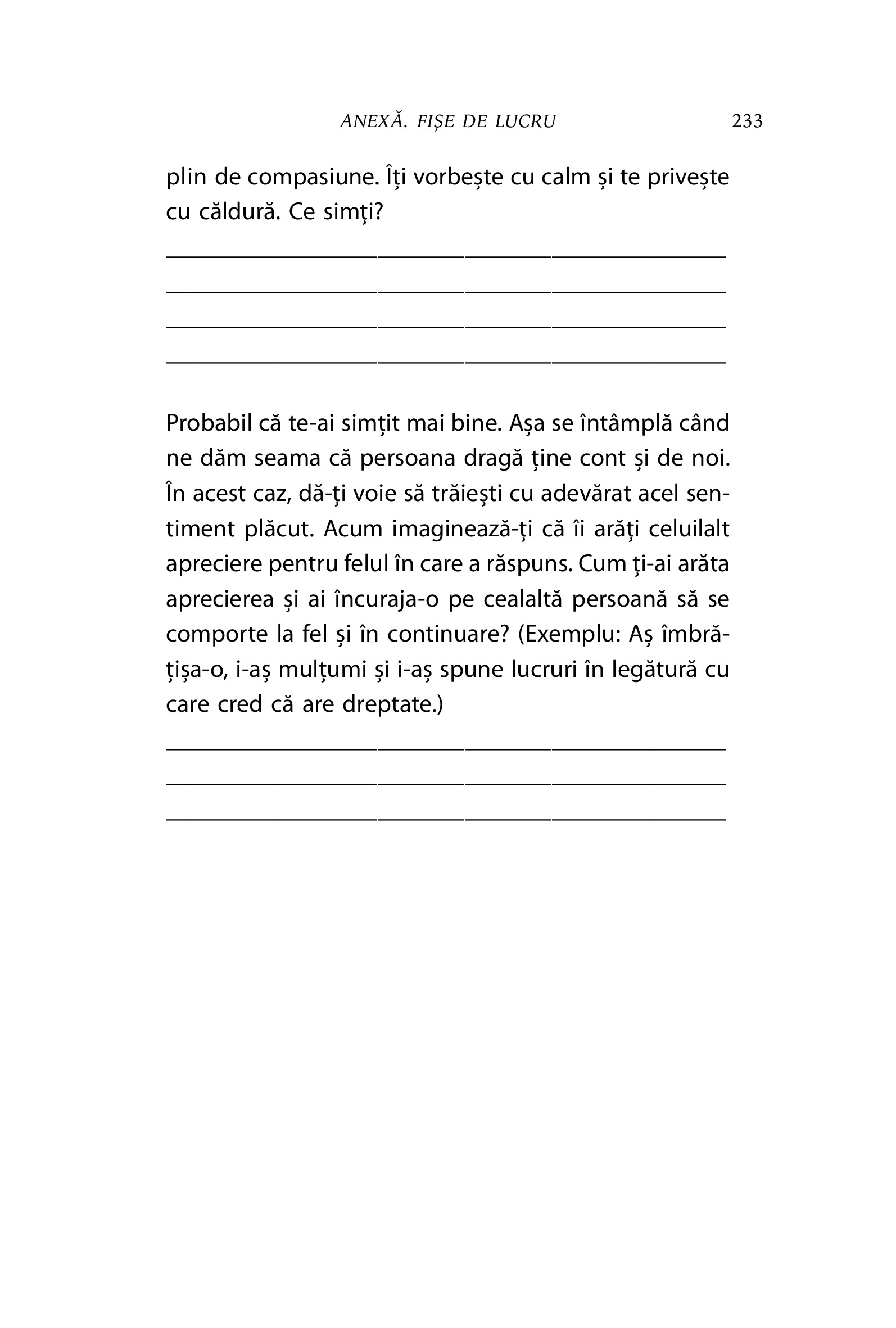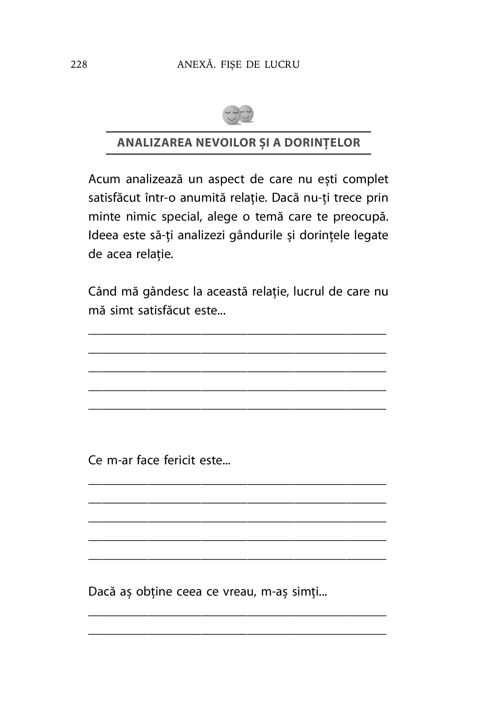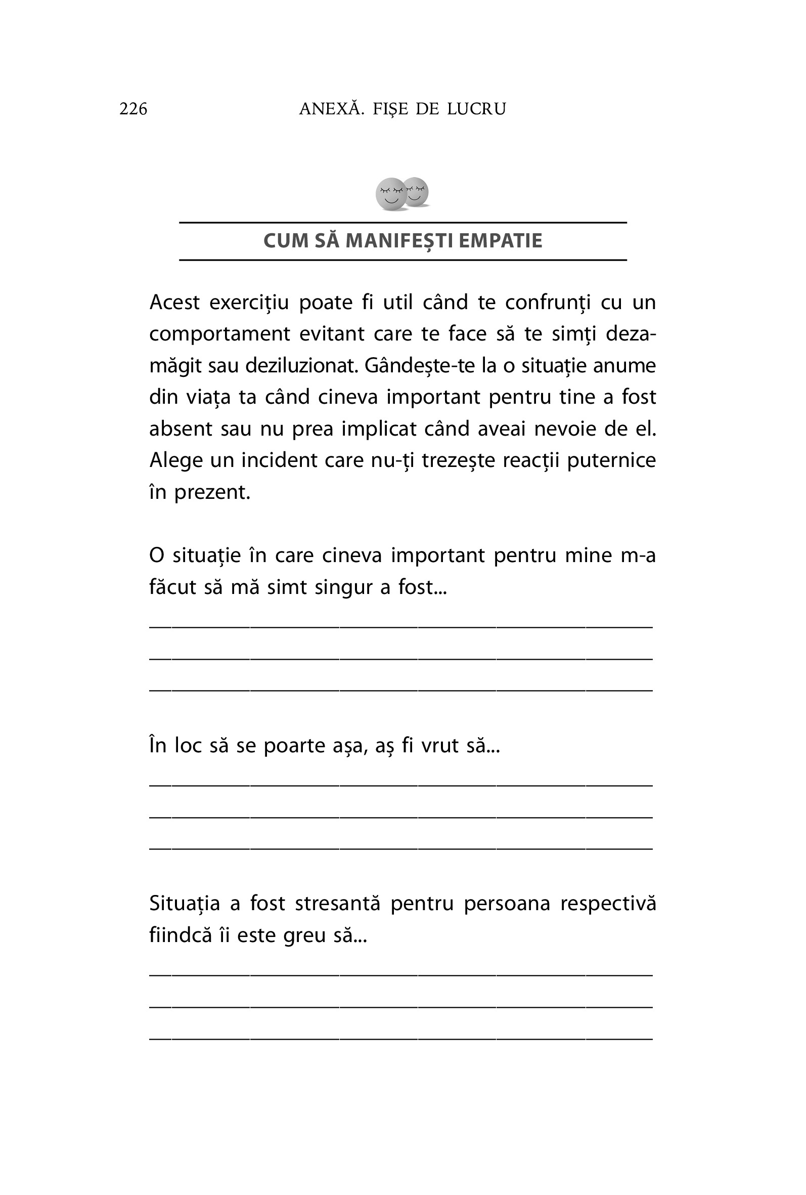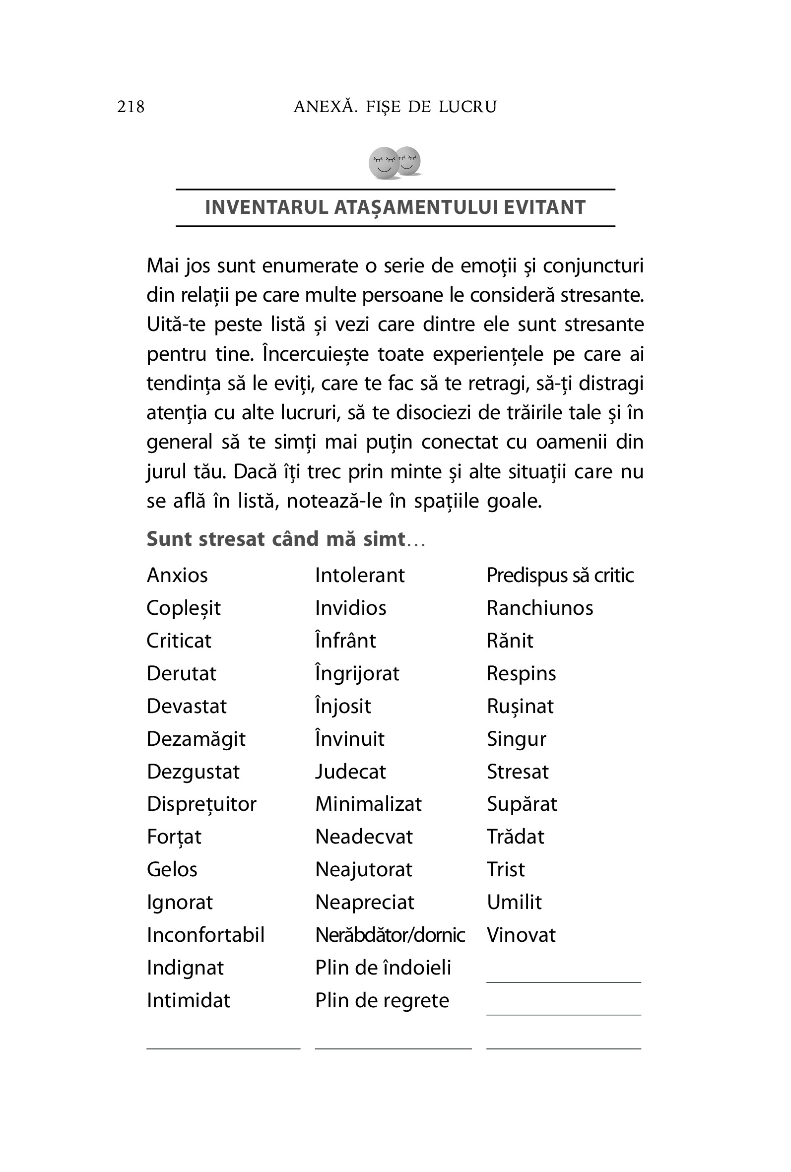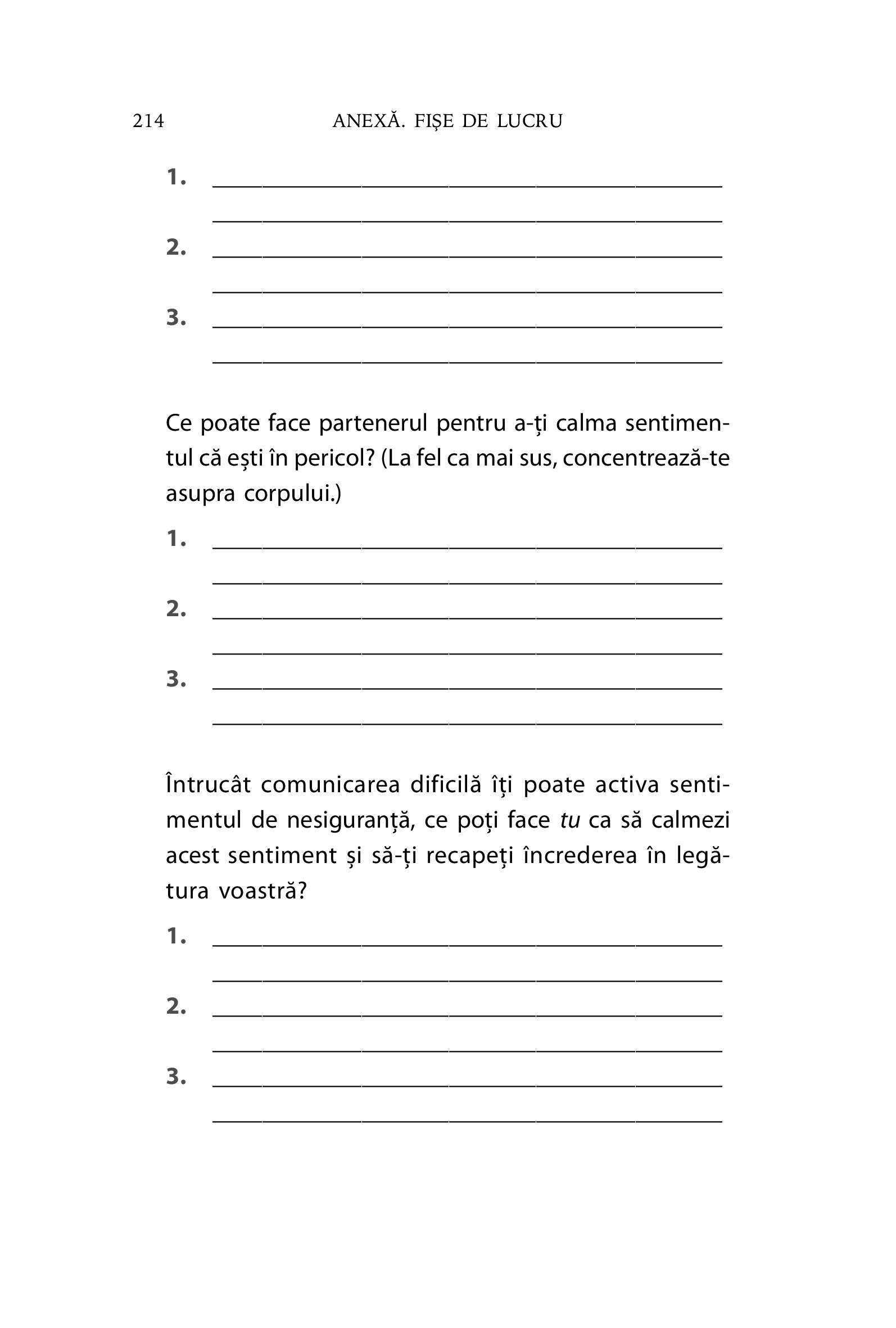 Răspunde la chestionarele din carte, încearcă exercițiile pe care ți le propune autoarea și află care este tipul tău de atașament, precum și tipul de atașament al celor dragi. Vei învăța astfel să înțelegi și să accepți emoțiile și gândurile ce stau la baza reacțiilor tale, vei putea să le gestionezi cu mai multă ușurință și vei fi capabil să faci alegeri mai înțelepte, pentru experiențe relaționale noi și pline de optimism.