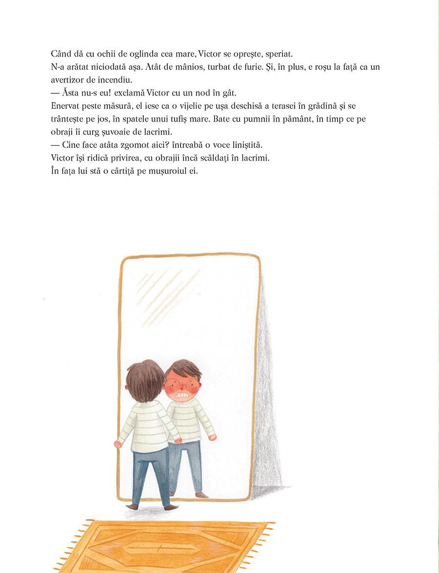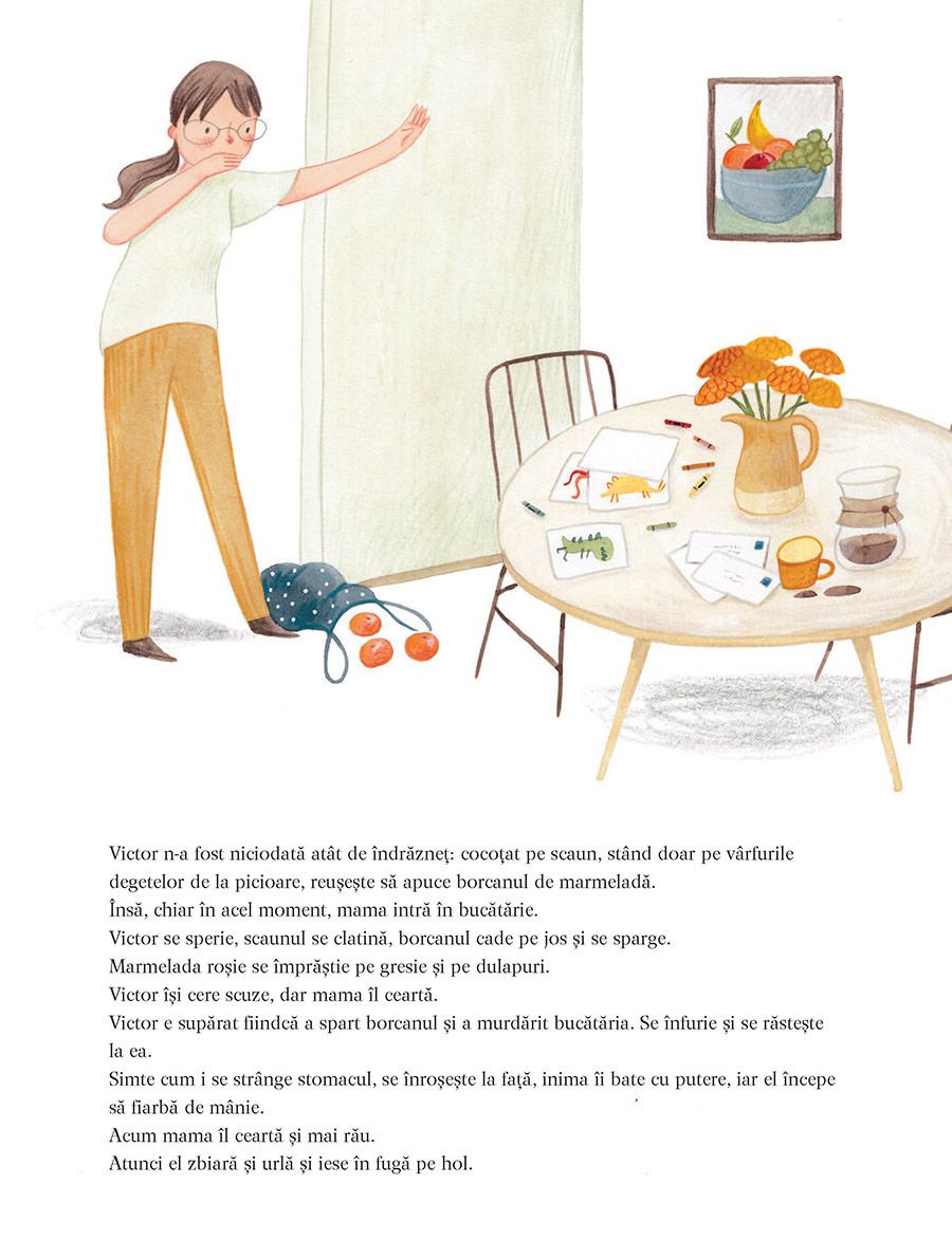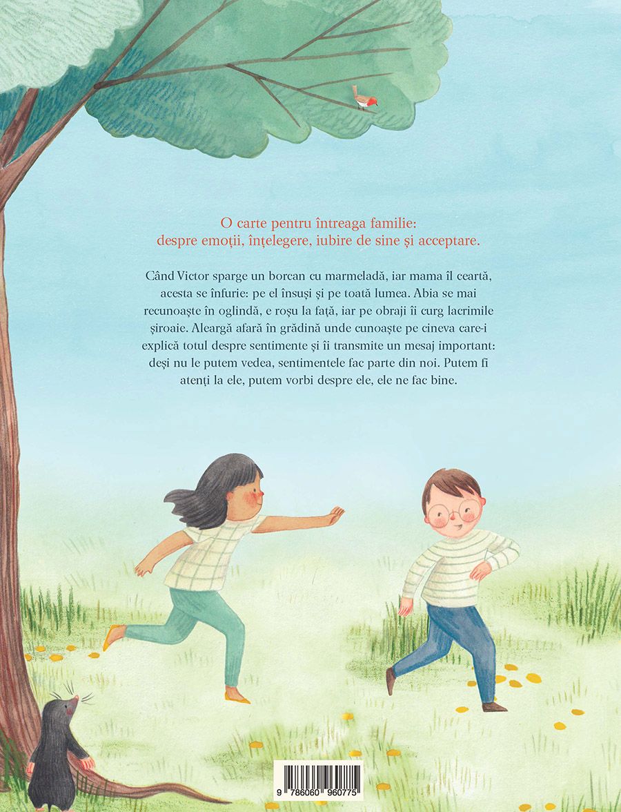 Când Victor sparge un borcan cu marmeladă, iar mama îl ceartă, acesta se înfurie: pe el însuși și pe toată lumea. Abia se mai recunoaște în oglindă, e roșu la față, iar pe obraji îi curg lacrimile șiroaie. Aleargă afară în grădină unde cunoaște pe cineva care-i explică totul despre sentimente și îi transmite un mesaj important: deși nu le putem vedea, sentimentele fac parte din noi. Putem fi atenți la ele, putem vorbi despre ele, ele ne fac bine.