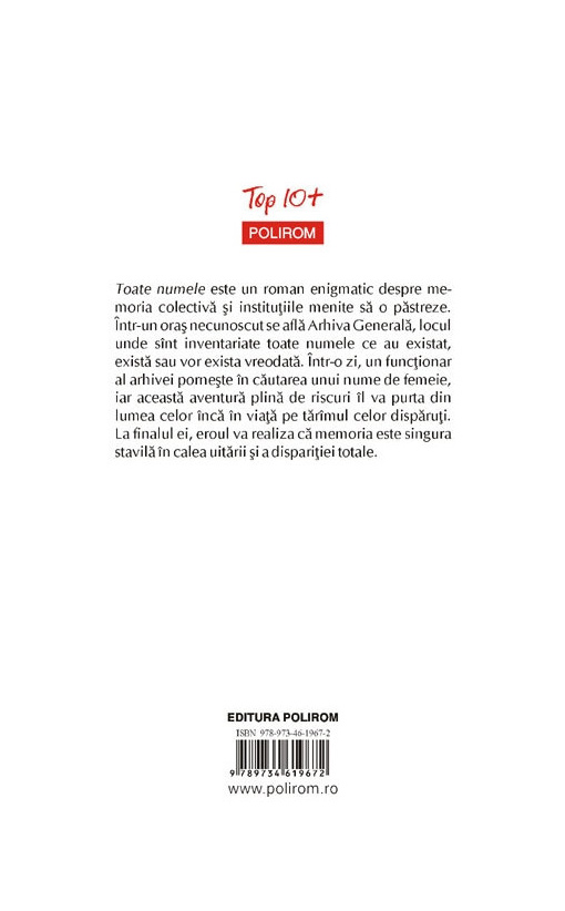 Toate numele este un roman enigmatic despre memoria colectiva si institutiile menite sa o pastreze. Intr-un oras necunoscut se afla Arhiva Generala, locul unde sint inventariate toate numele ce au existat, exista sau vor exista vreodata. Intr-o zi, un functionar al arhivei porneste in cautarea unui nume de femeie, iar aceasta aventura plina de riscuri il va purta din lumea celor inca in viata pe tarimul celor disparuti. La finalul ei eroul va realiza ca memoria este singura stavila in calea uitarii si a disparitiei totale.