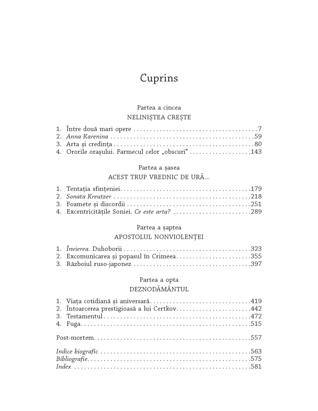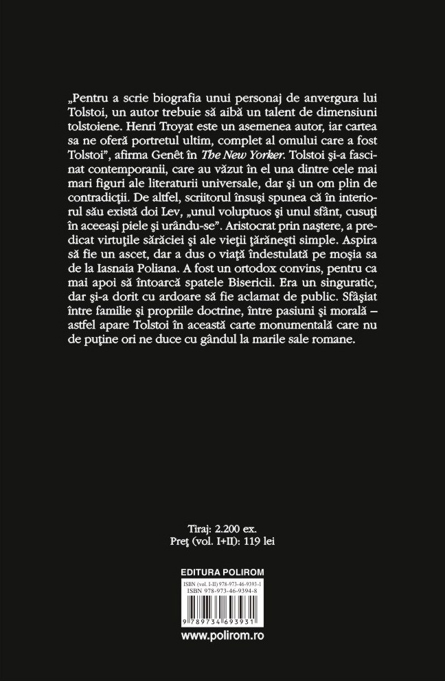 „Pentru a scrie biografia unui personaj de anvergura lui Tolstoi, un autor trebuie să aibă un talent de dimensiuni tolstoiene. Henri Troyat este un asemenea autor, iar cartea sa ne oferă portretul ultim, complet al omului care a fost Tolstoi”, afirma Genêt în The New Yorker. Tolstoi și-a fascinat contemporanii, care au văzut în el una dintre cele mai mari figuri ale literaturii universale, dar și un om plin de contradicții. De altfel, scriitorul însuși spunea că în interiorul său există doi Lev, „unul voluptuos și unul sfânt, cusuți în aceeași piele și urându-se”. Aristocrat prin naștere, a predicat virtuțile sărăciei și ale vieții țărănești simple. Aspira să fie un ascet, dar a dus o viață îndestulată pe moșia sa de la Iasnaia Poliana. A fost un ortodox convins, pentru ca mai apoi să întoarcă spatele Bisericii. Era un singuratic, dar și-a dorit cu ardoare să fie aclamat de public. Sfâșiat între familie și propriile doctrine, între pasiuni și morală – astfel apare Tolstoi în această carte monumentală care nu de puține ori ne duce cu gândul la marile sale romane.