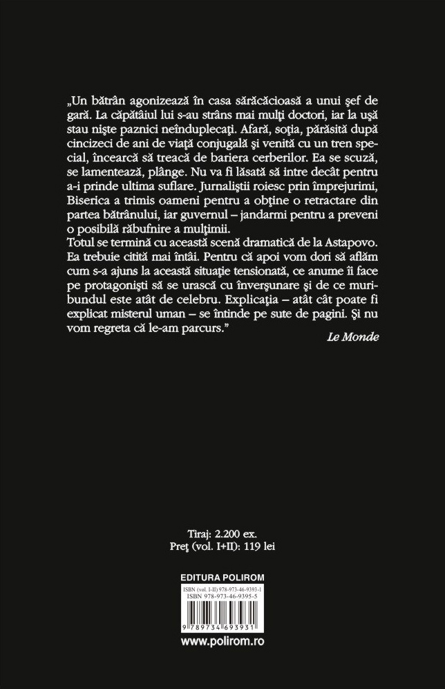 Totul se termină cu această scenă dramatică de la Astapovo. Ea trebuie citită mai întâi. Pentru că apoi vom dori să aflăm cum s-a ajuns la această situație tensionată, ce anume îi face pe protagoniști să se urască cu înverșunare și de ce muribundul este atât de celebru. Explicația – atât cât poate fi explicat misterul uman – se întinde pe sute de pagini. Și nu vom regreta că le-am parcurs.” (Le Monde)