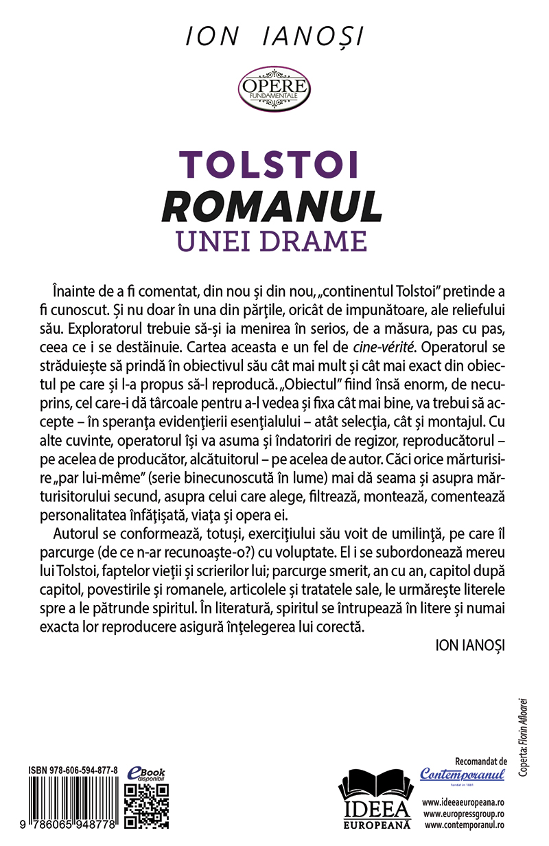 Autorul se conformează, totuşi, exerciţiului său voit de umilinţă, pe care îl parcurge (de ce n-ar recunoaşte-o?) cu voluptate. El i se subordonează mereu lui Tolstoi, faptelor vieţii şi scrierilor lui; parcurge smerit, an cu an, capitol după capitol, povestirile şi romanele, articolele şi tratatele sale, le urmăreşte literele spre a le pătrunde spiritul. În literatură, spiritul se întrupează în litere şi numai exacta lor reproducere asigură înţelegerea lui corectă. / Ion Ianoși