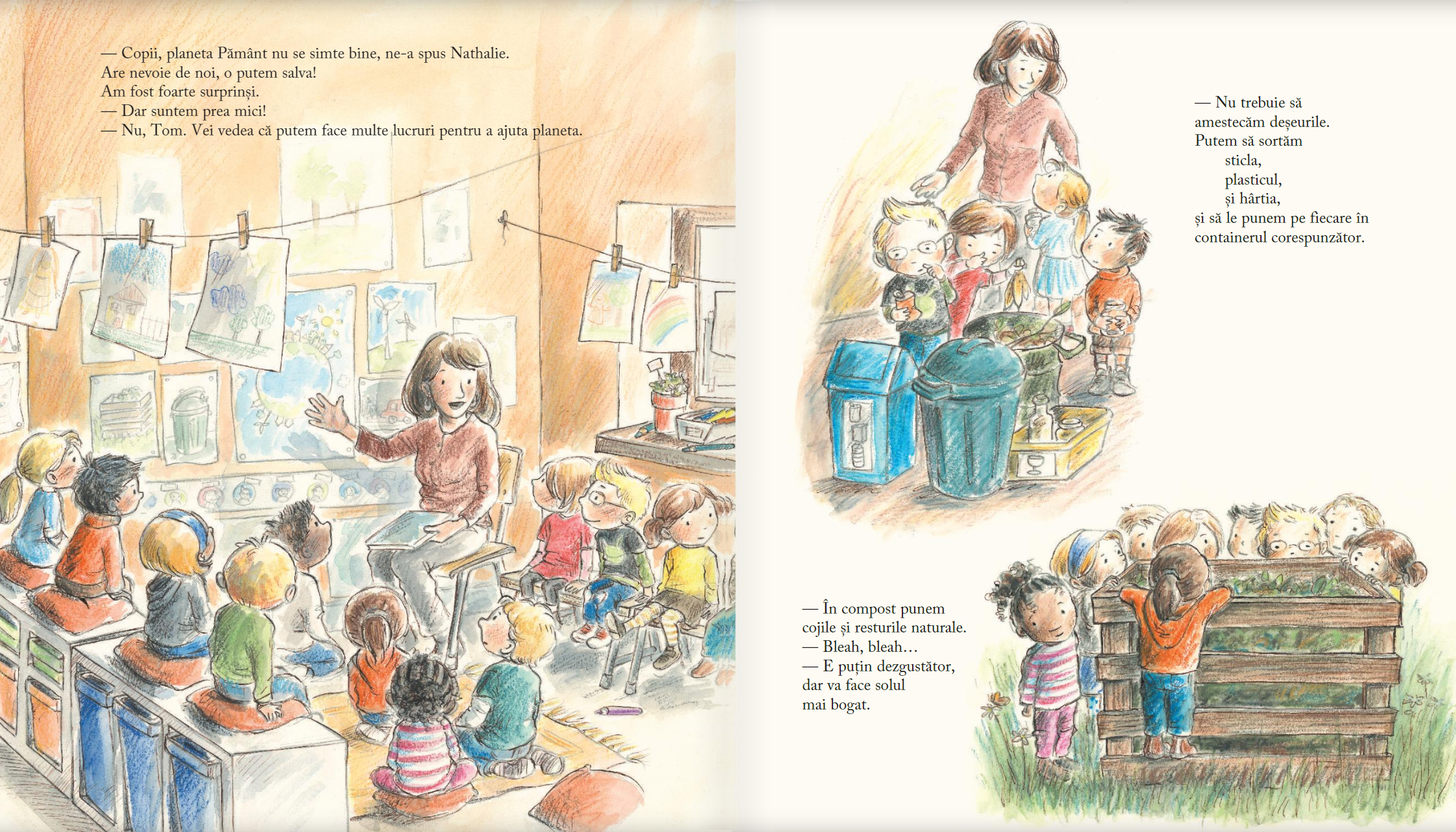 La școală, Tom a învățat cum să ajute planeta: să sorteze, să recicleze...