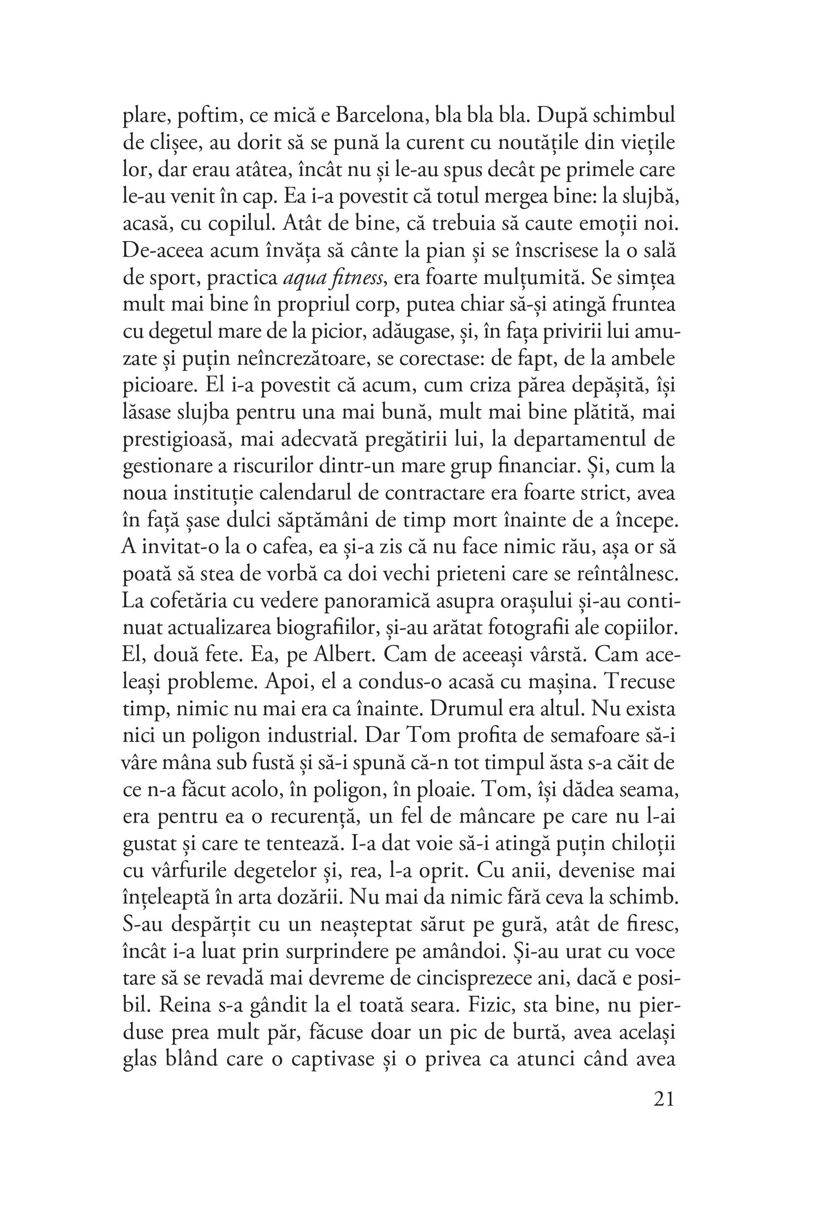 Ce a fost bun și ce a fost rău în deciziile Reinei Gené, care și-a croit o solidă carieră internațională? Cât bine și cât rău este dispusă să facă pentru a-și proteja fiul de 17 ani a cărui tentativă de sinucidere îi împarte viața între un înainte și un după? Blocată de viscol în aeroportul Henri Coandă din București, legată de lumea ei doar prin prețiosul telefon mobil, pragmatica și ambițioasa psiholoagă din Barcelona își descoperă vulnerabilitatea, obligată să navigheze prin meandrele unui trecut pe care îl crezuse încheiat și uitat.
