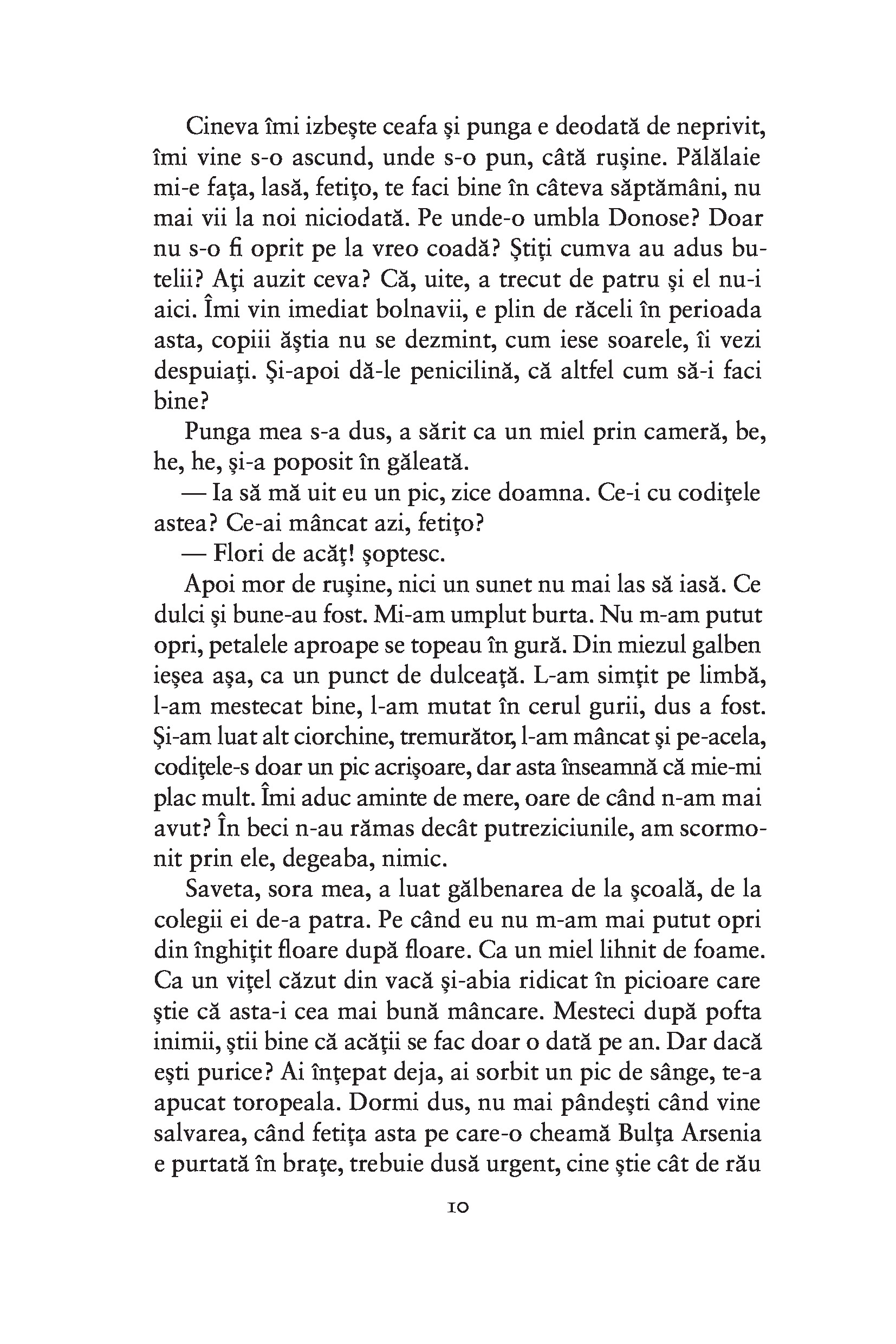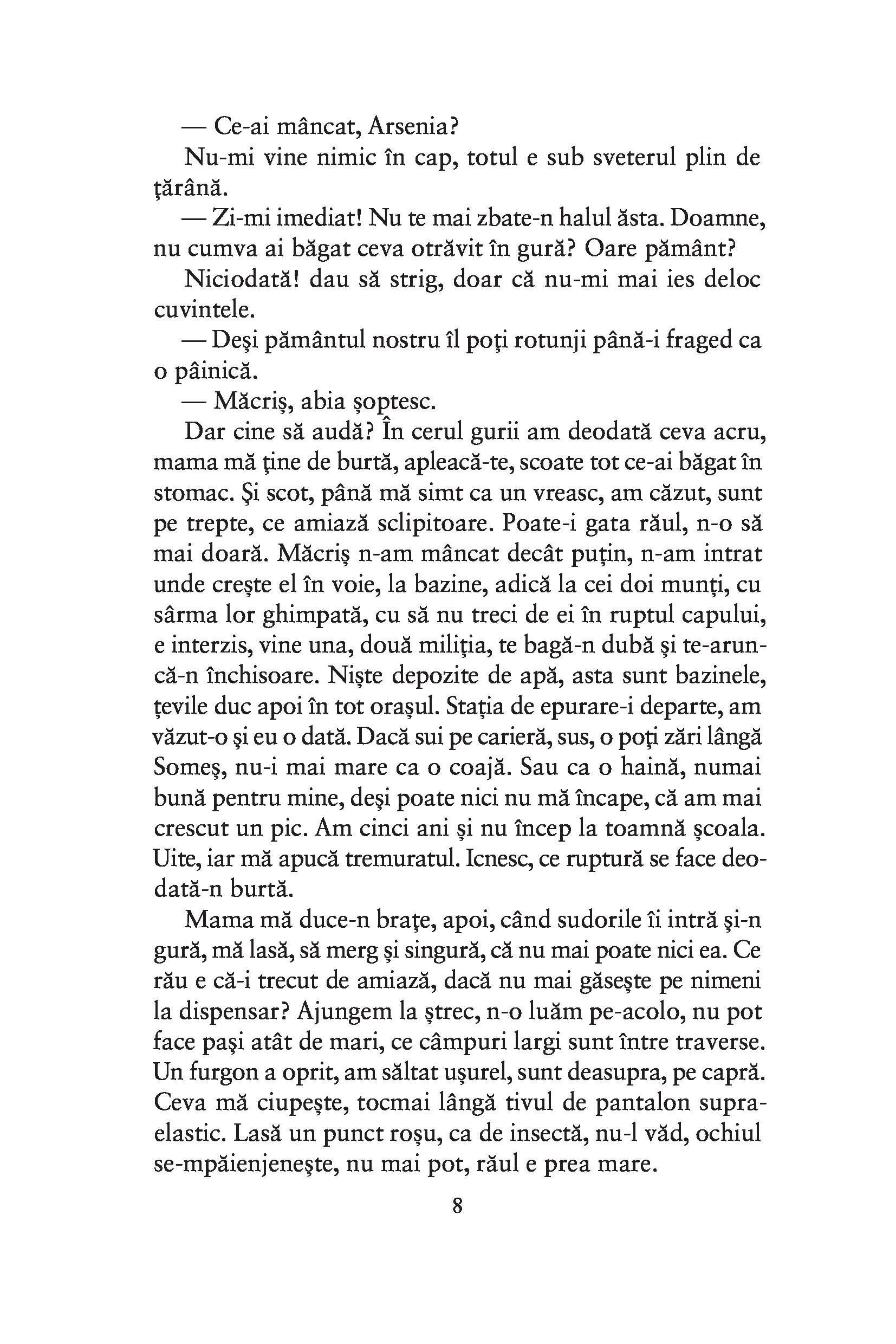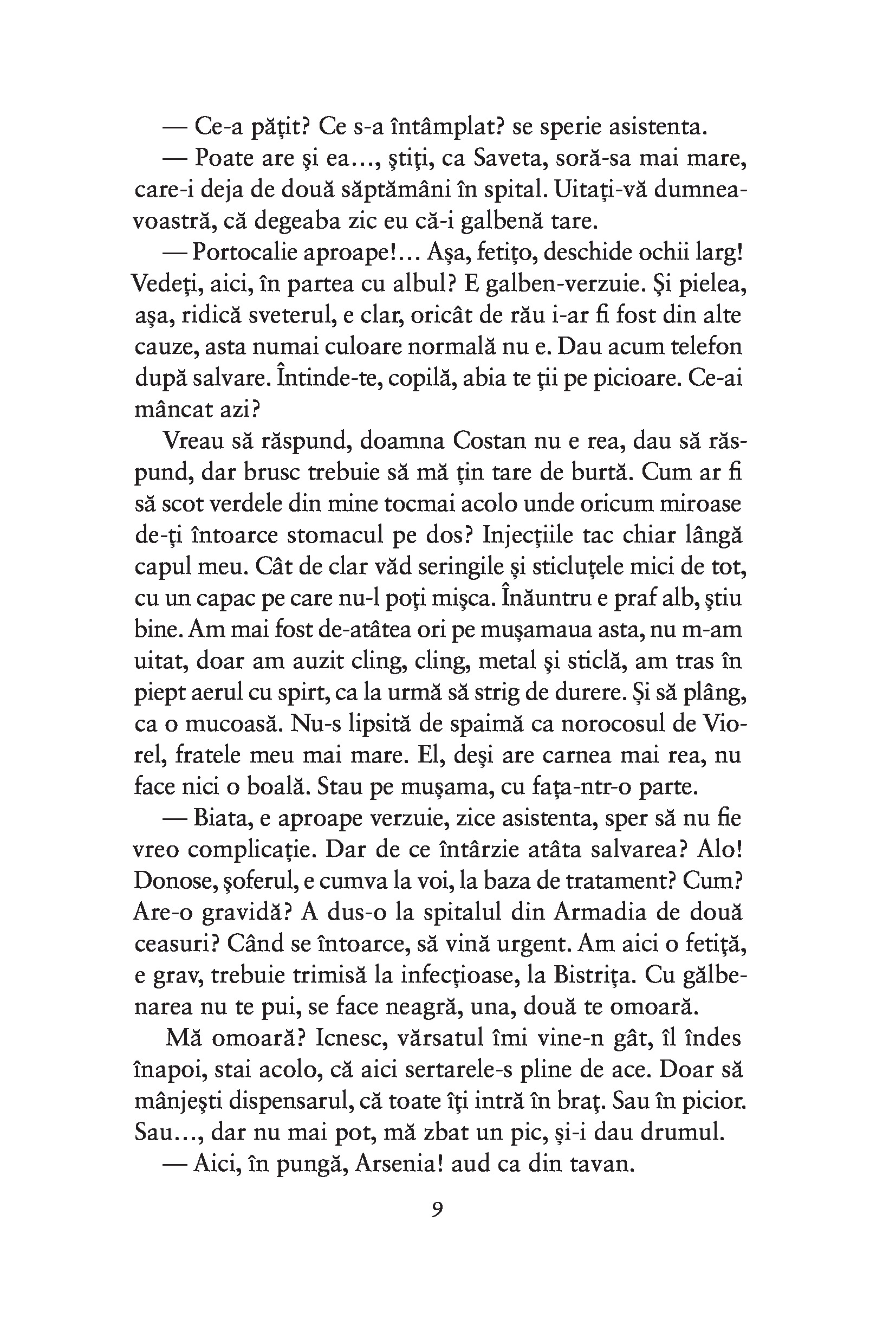 Suntem în ultimul deceniu de comunism, cu strangulările și iluziile lui. Continuând saga familiei pe care cititorul o știe deja din Pelinul negru și Cartea Reghinei, Ioana Nicolaie ne spune în acest nou roman povestea Arseniei. Copilul trăiește sub o dublă presiune, a discursului oficial absurd și a lumii patriarhale în care s-a născut, și se luptă să-și găsească un drum în viață. Întâmplările prin care trece, cu aura lor de poezie și fantastic la-nceput, cu greutățile tot mai mari pe măsură ce crește, se înfășoară pe întrebarea cu răspuns greu de lămurit: ce-o așteaptă mai departe, în viață, ce-o să se facă ea când va fi mare? Femeie de serviciu la blocurile gri din oraș, fotograf, sportivă, gestionară, profesoară?