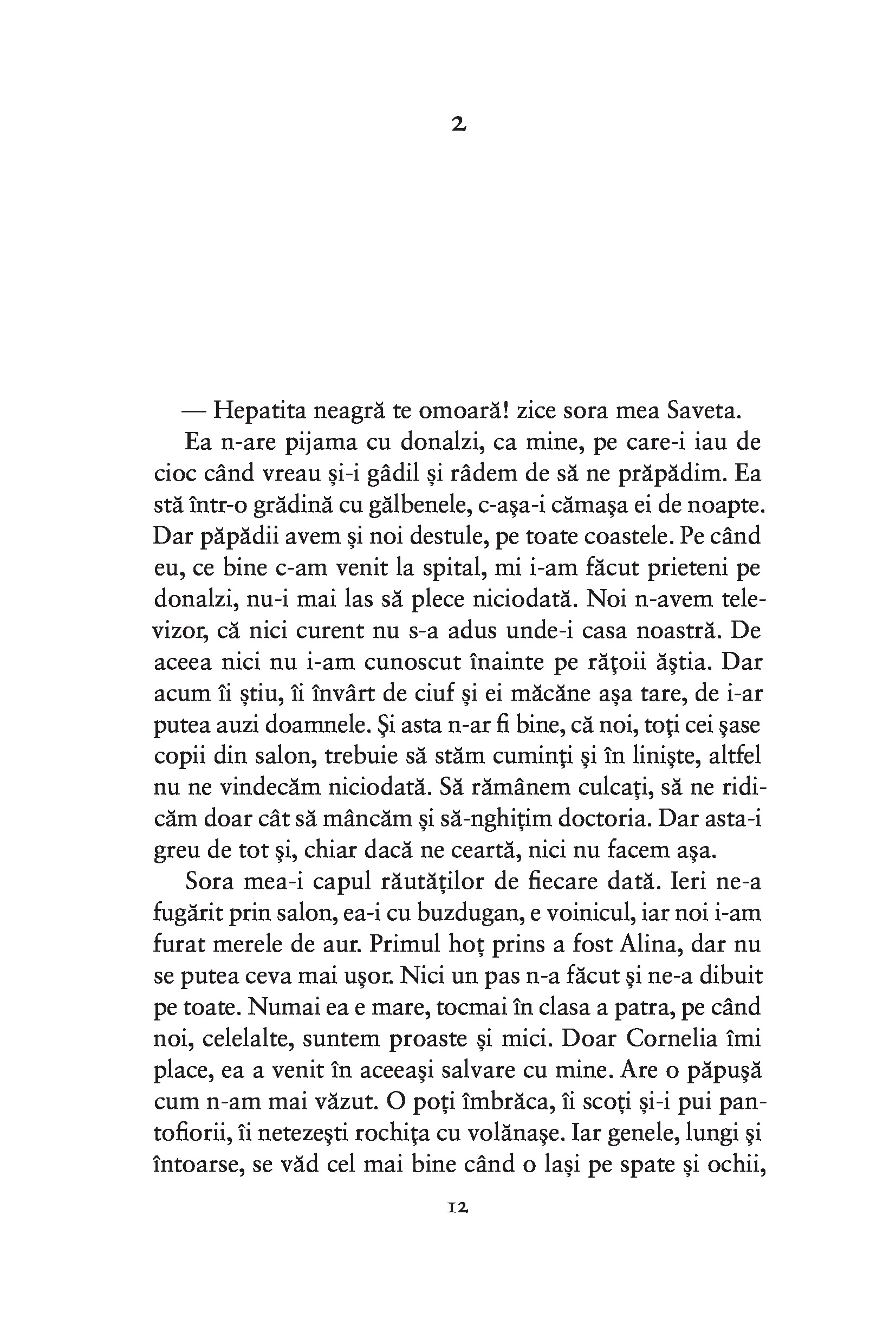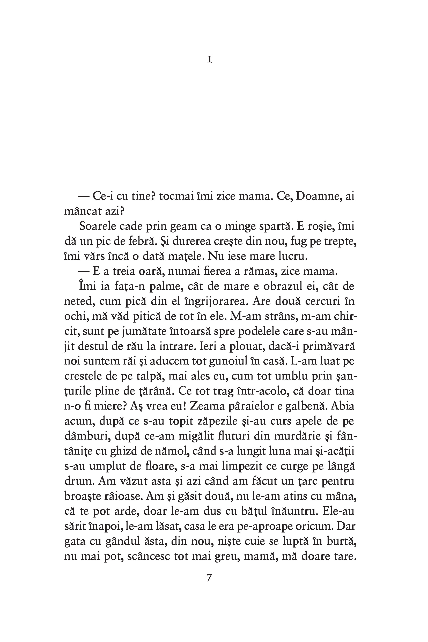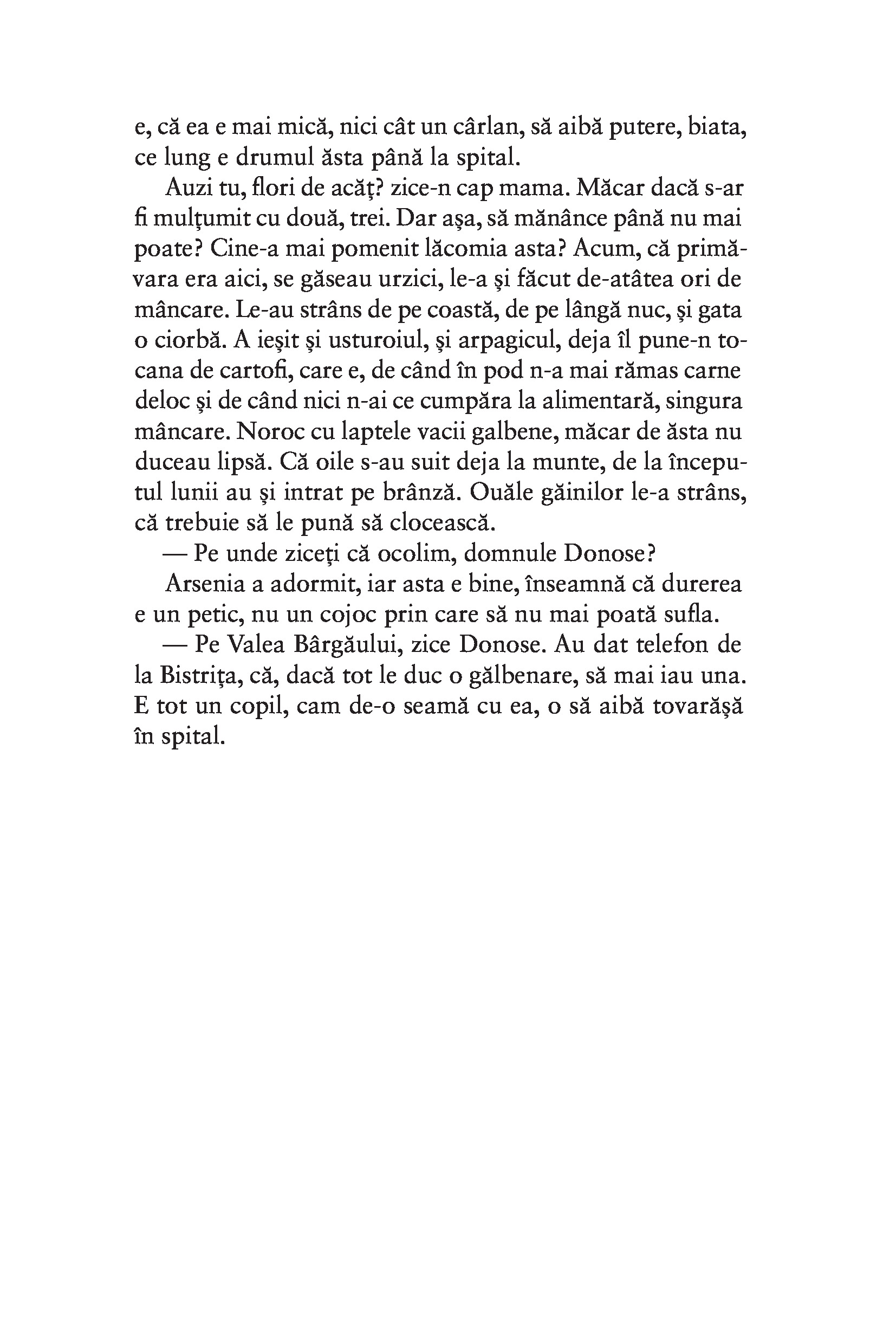 Suntem în ultimul deceniu de comunism, cu strangulările și iluziile lui. Continuând saga familiei pe care cititorul o știe deja din Pelinul negru și Cartea Reghinei, Ioana Nicolaie ne spune în acest nou roman povestea Arseniei. Copilul trăiește sub o dublă presiune, a discursului oficial absurd și a lumii patriarhale în care s-a născut, și se luptă să-și găsească un drum în viață. Întâmplările prin care trece, cu aura lor de poezie și fantastic la-nceput, cu greutățile tot mai mari pe măsură ce crește, se înfășoară pe întrebarea cu răspuns greu de lămurit: ce-o așteaptă mai departe, în viață, ce-o să se facă ea când va fi mare? Femeie de serviciu la blocurile gri din oraș, fotograf, sportivă, gestionară, profesoară?